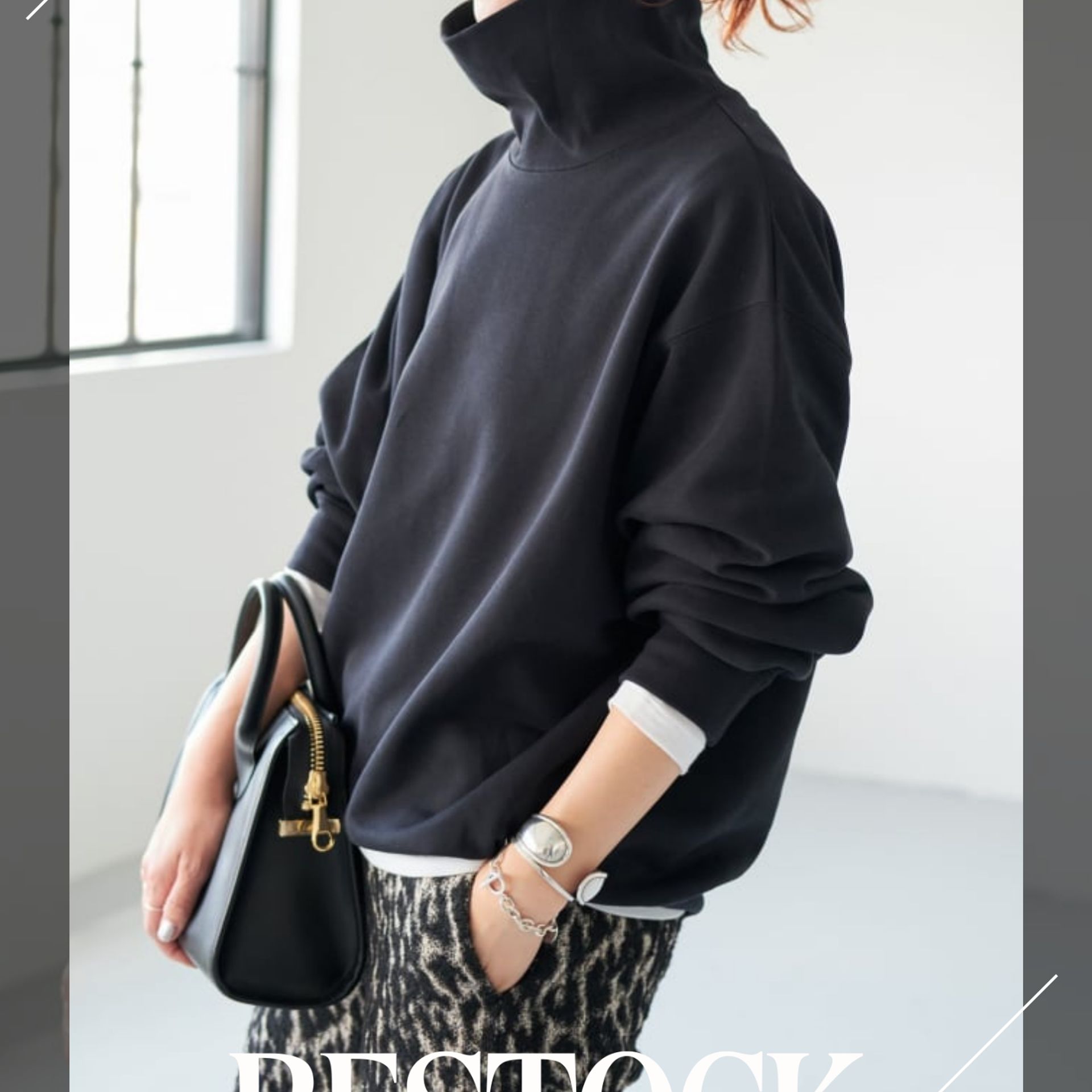 首元を包むハイネックデザインは一枚でサマになり、レイヤードも簡単。