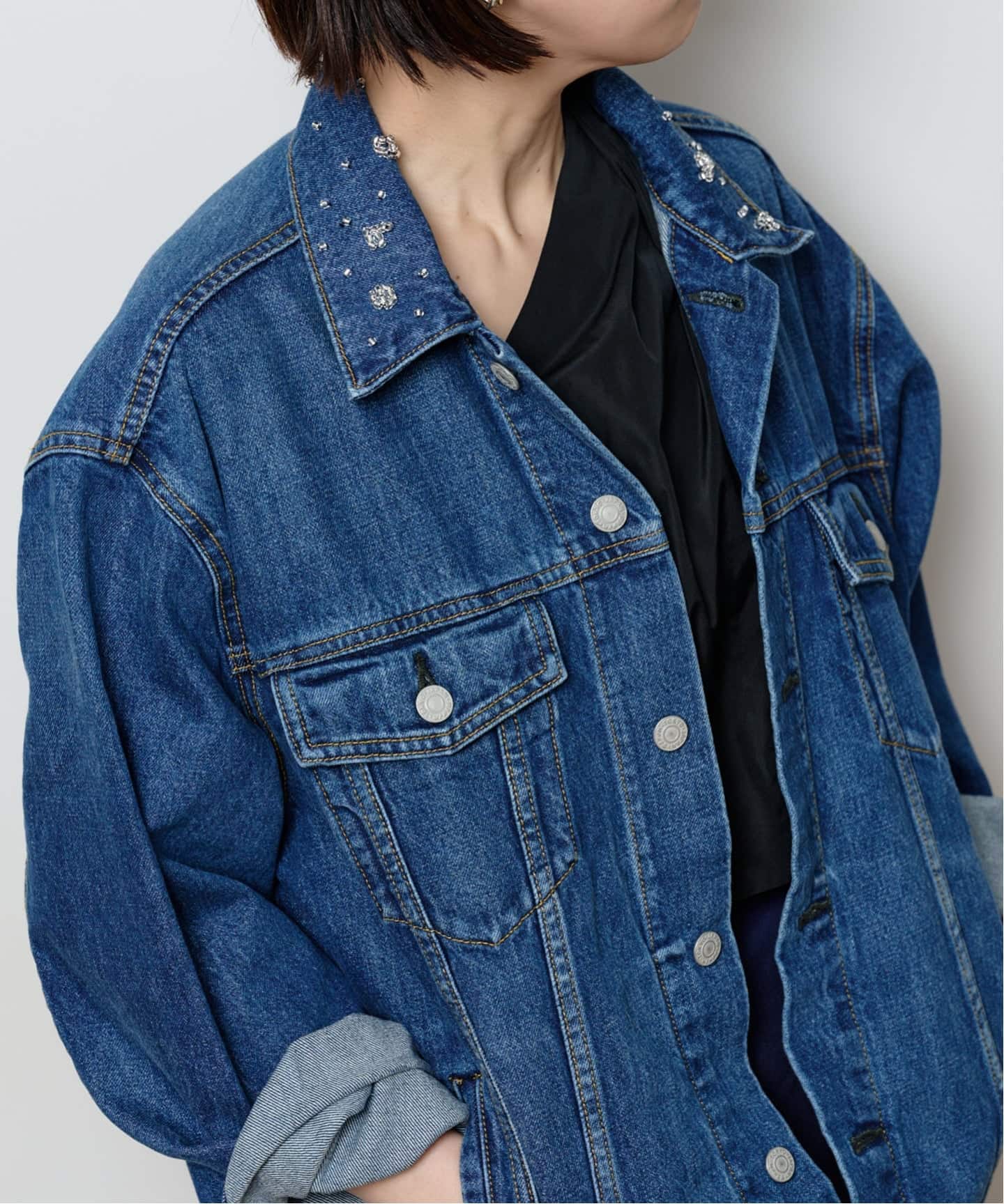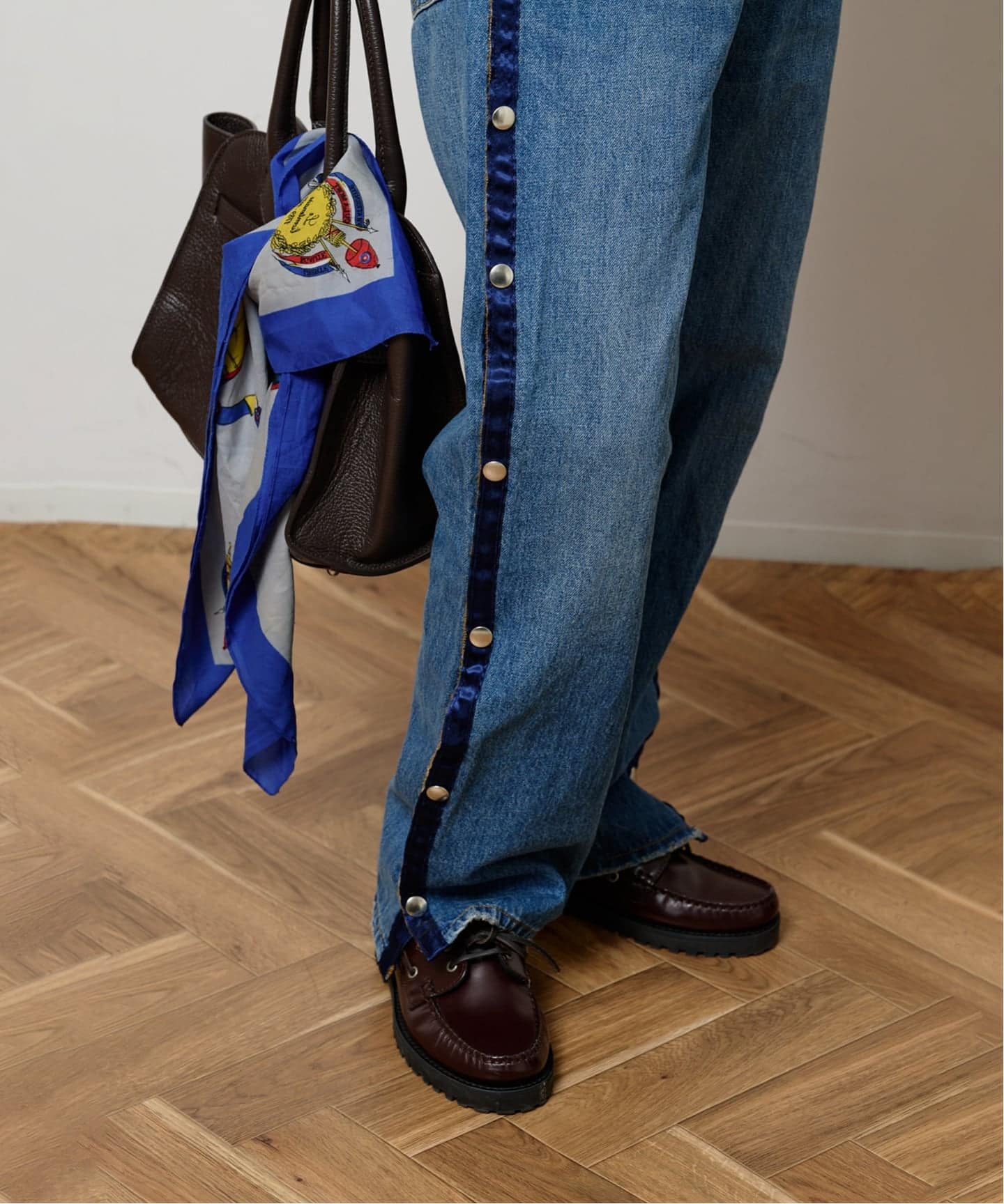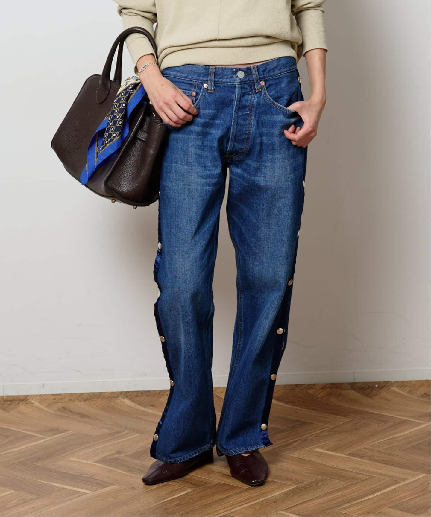 サテン生地とシルバーボタンがアクセントのスリットデニム