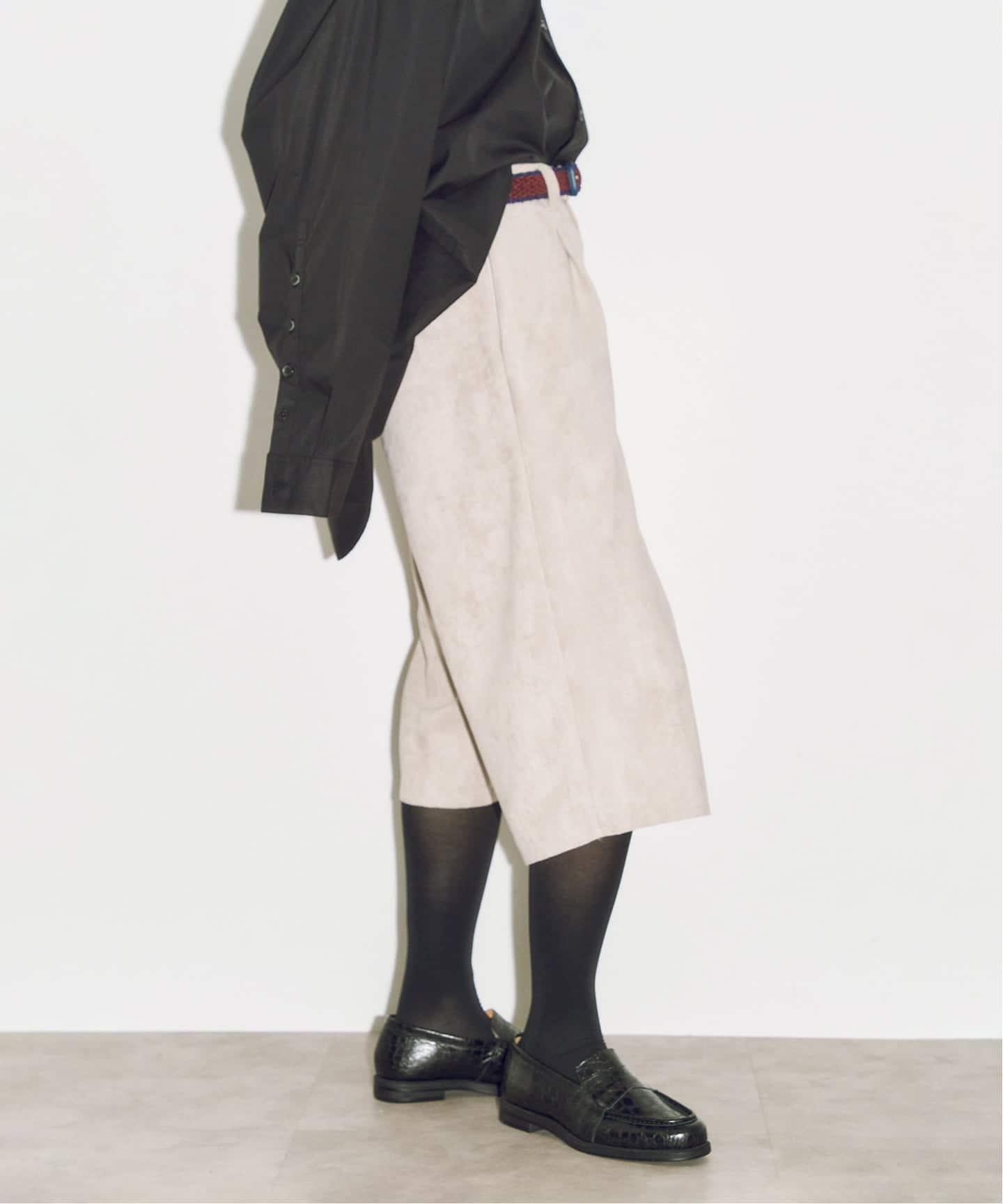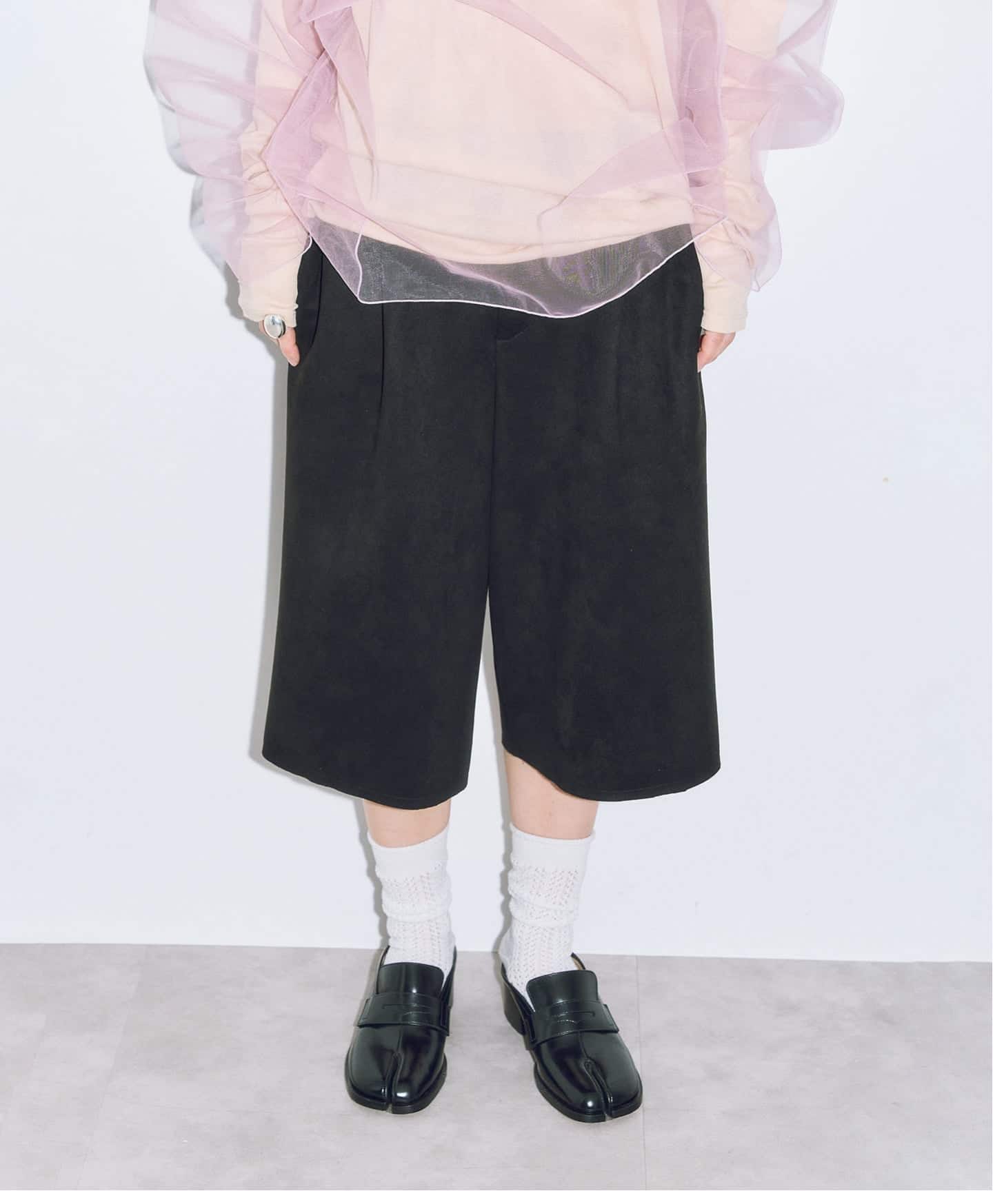 ボトムスは、すっきりストレートシルエットのスエードショートパンツ。