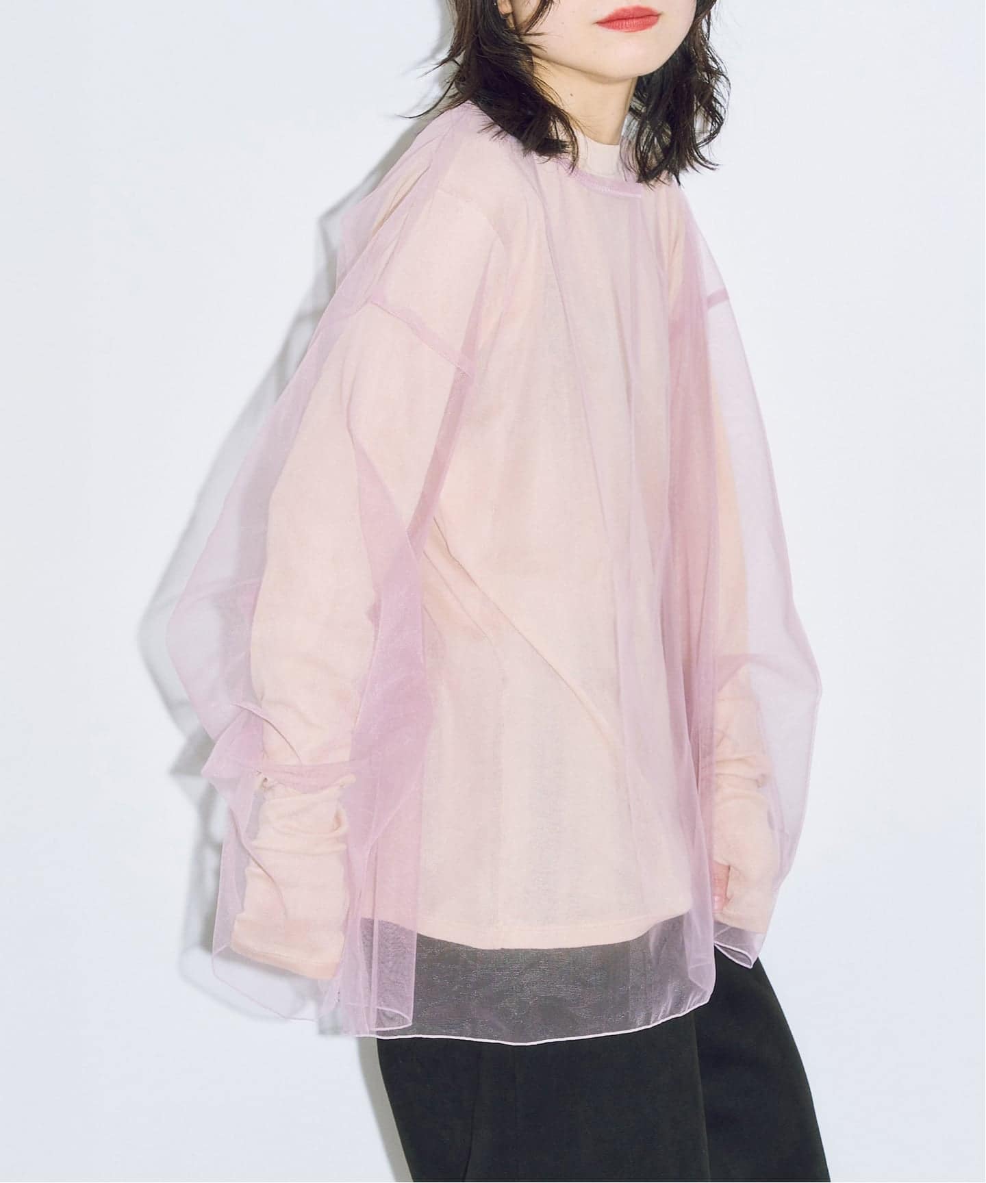 カラーTシャツやシアーハイネックなど、インナーとのレイヤードを楽しめます。