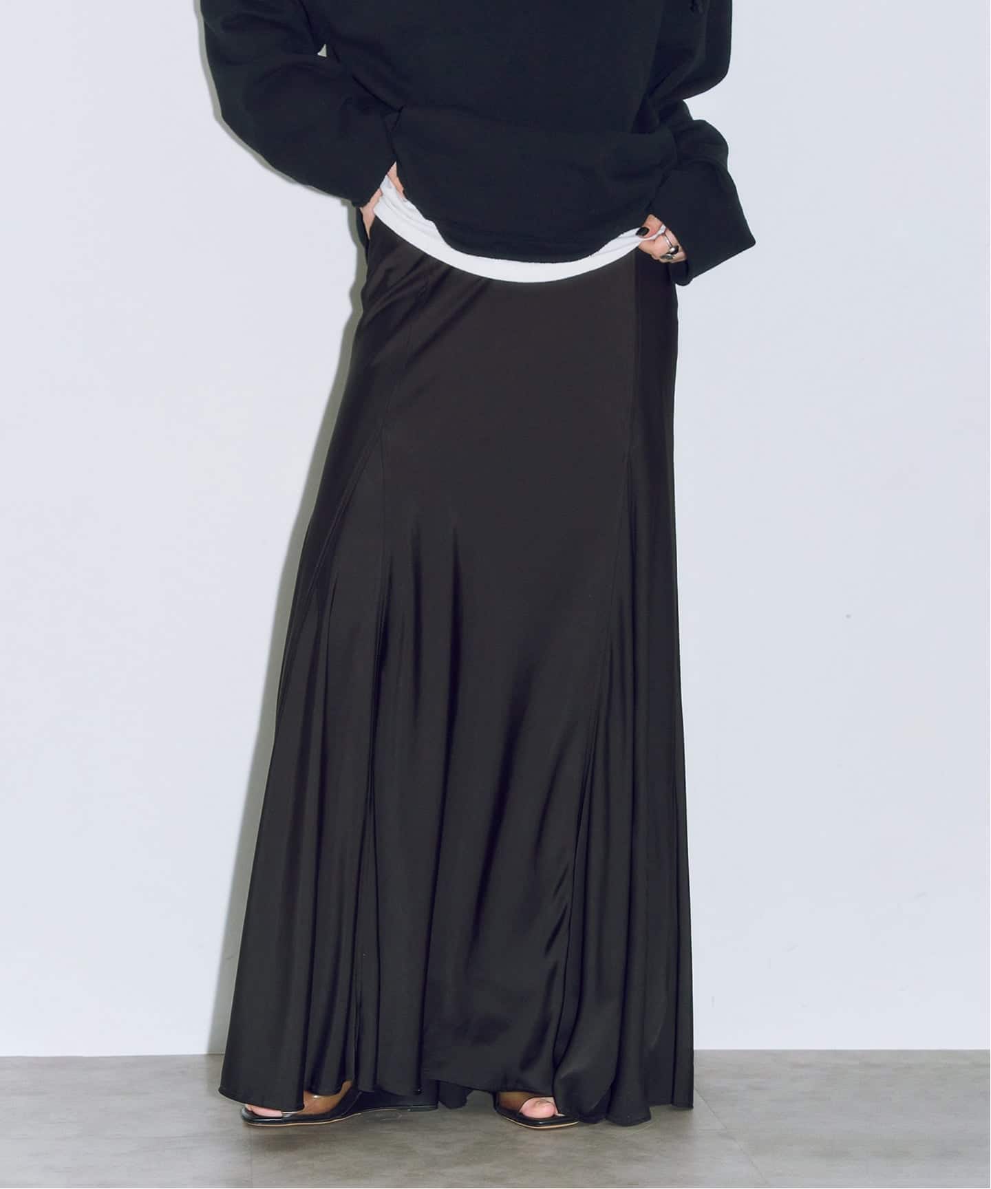 丸みを帯びたフォルムと、裾にたまるシルエットがスタイリングにアクセントをプラス。