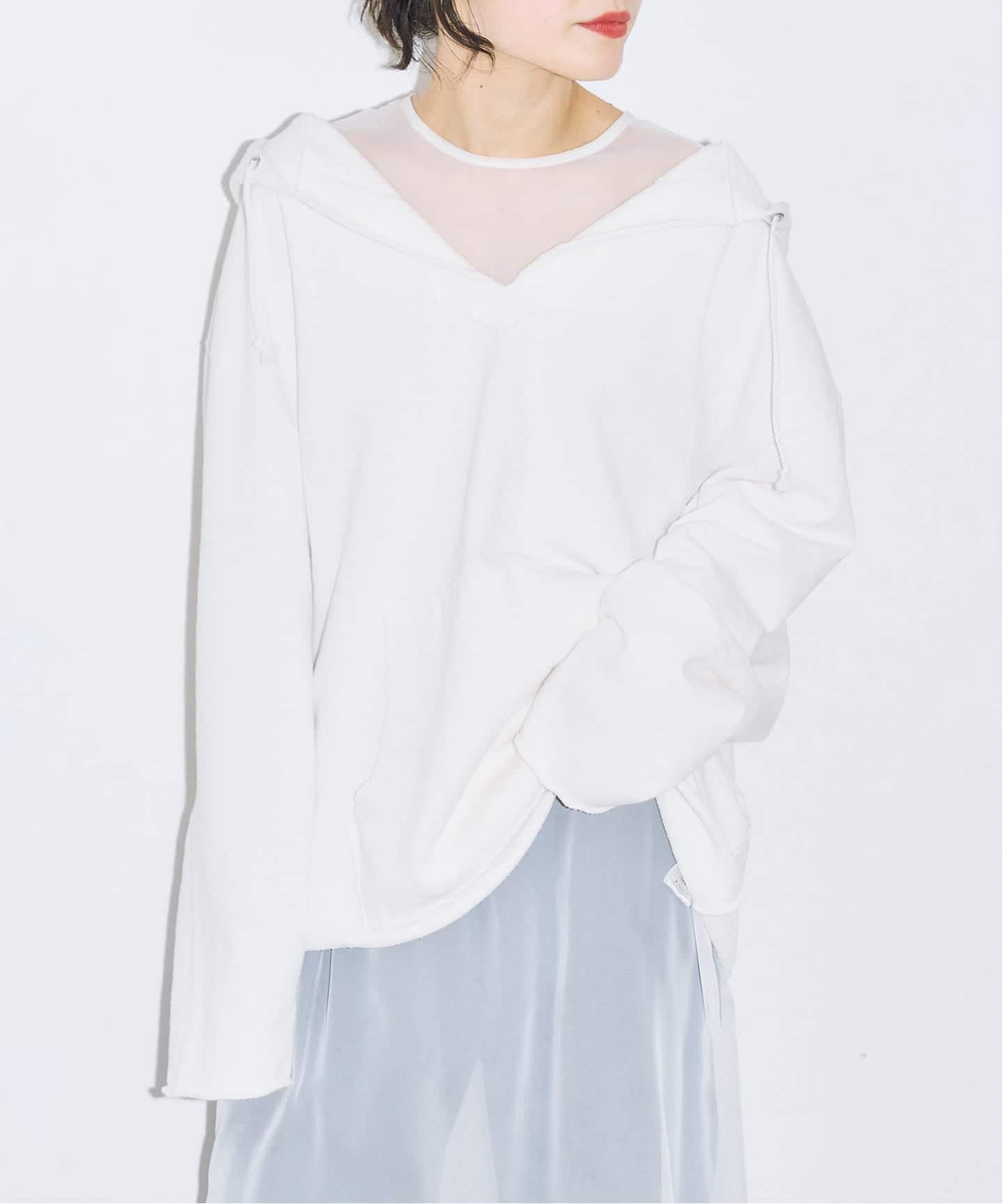 メンズライクなオーバーサイズのフーディに、シアー素材のドレスを重ねた軽さのある着こなし。