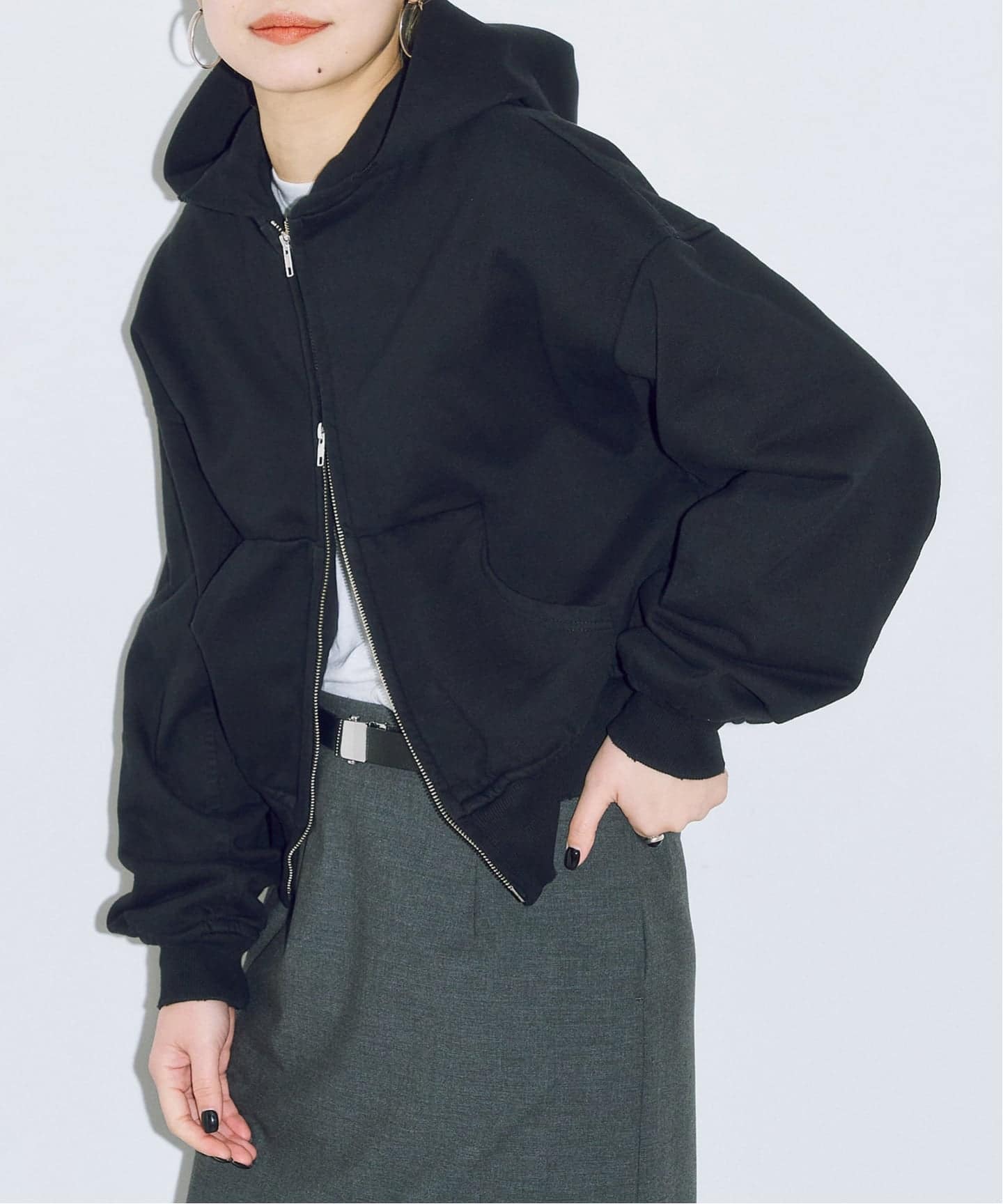 コンパクトな丈感のフーディーに、Iラインのロングスカートを合わせたスタイリング。