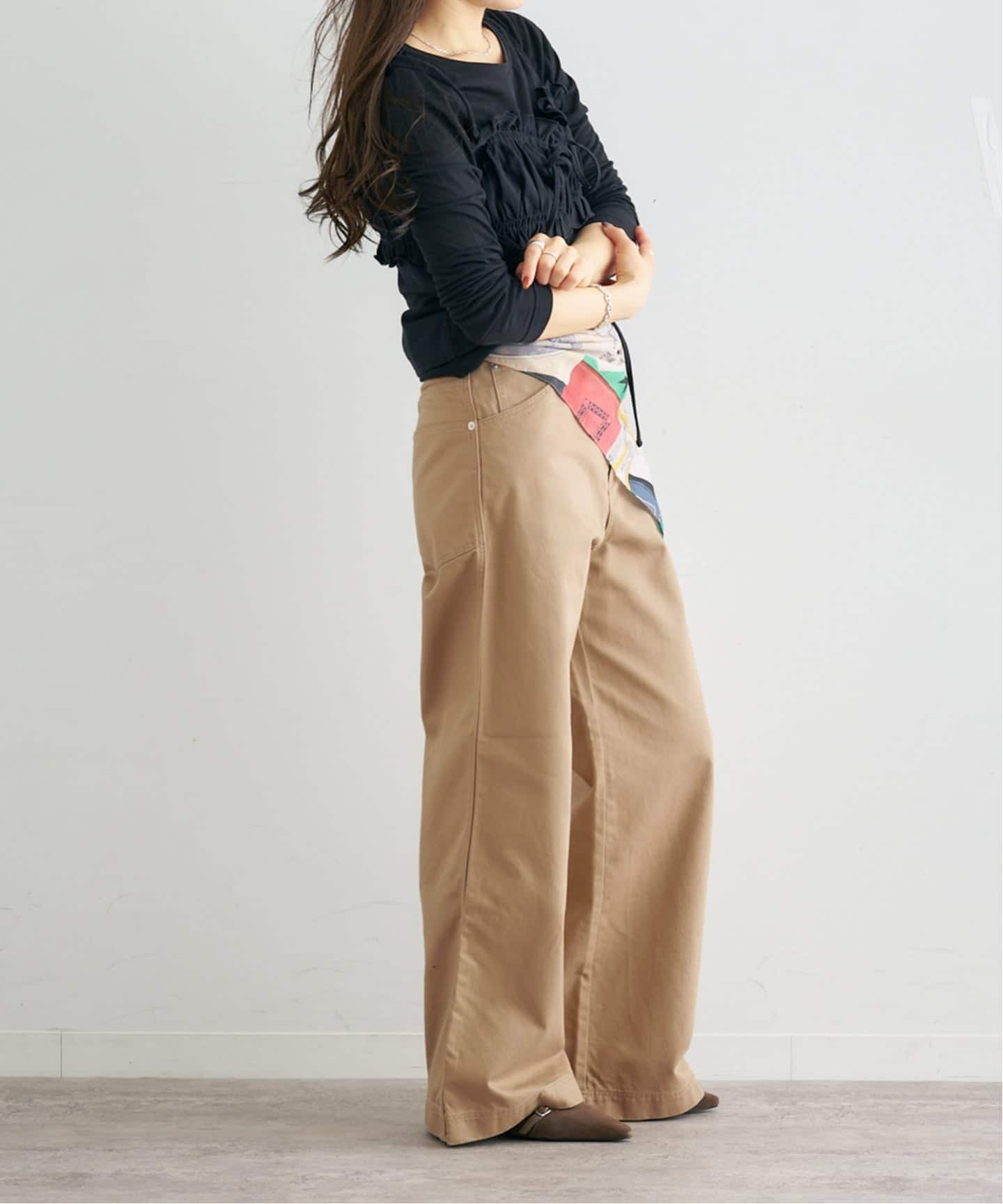 シンプルなトップス合わせでもスタイリングが成立しやすく、日常使いしやすい一本。