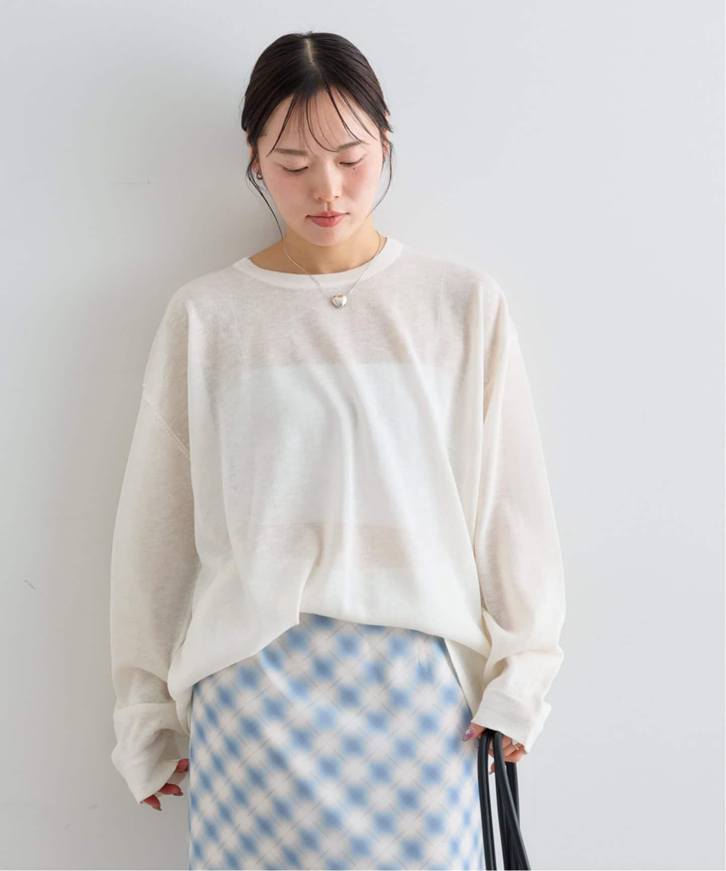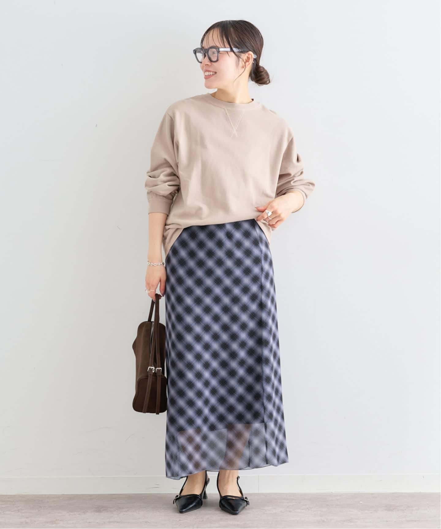 チェック柄とシアー素材を組み合わせたタイトスカート。