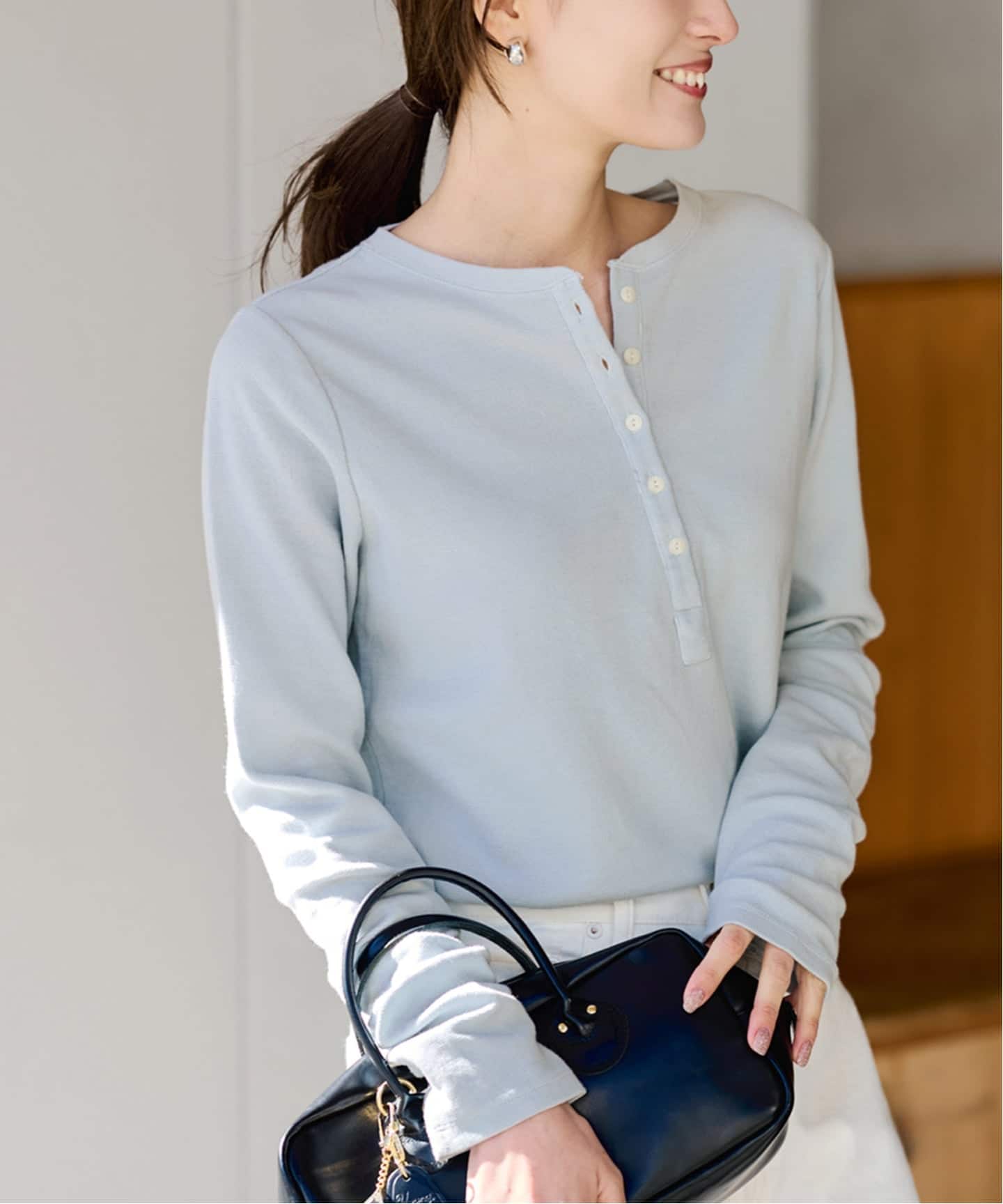 ヘンリーネックなので、ロンTを重ねたレイヤードスタイルもおすすめ。