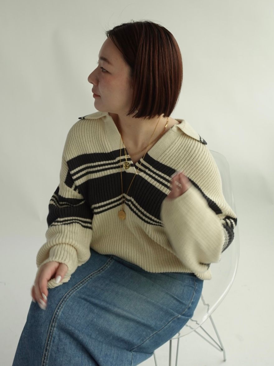 肉厚なコットン素材を使用し、春先まで長く楽しめるニット。リズム感のあるランダムボーダーに、女性らしさを引き立てる深めのVネックをプラスしました。