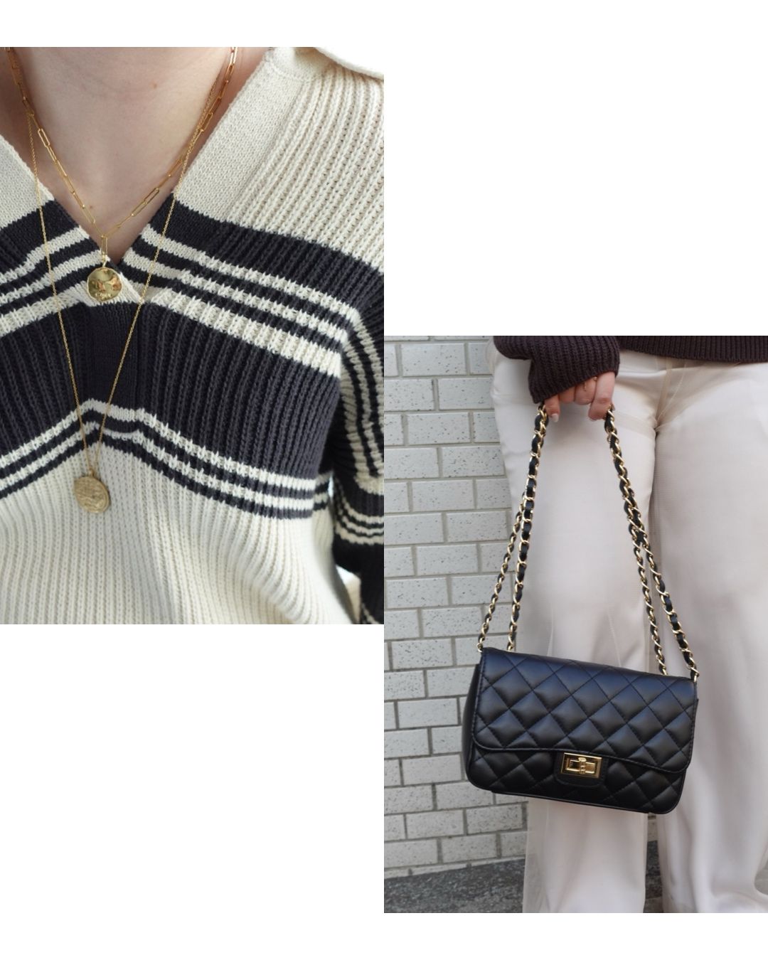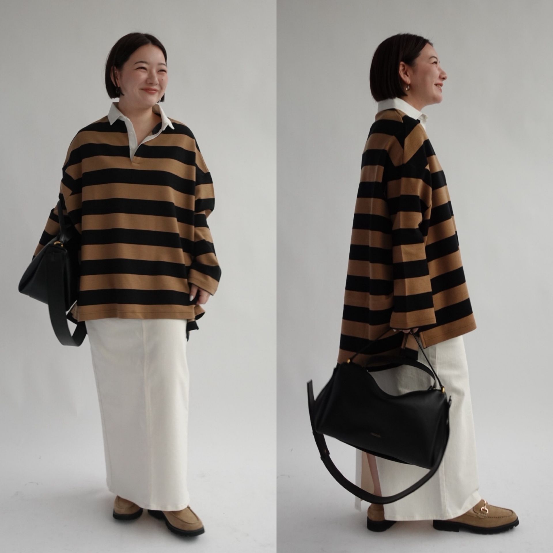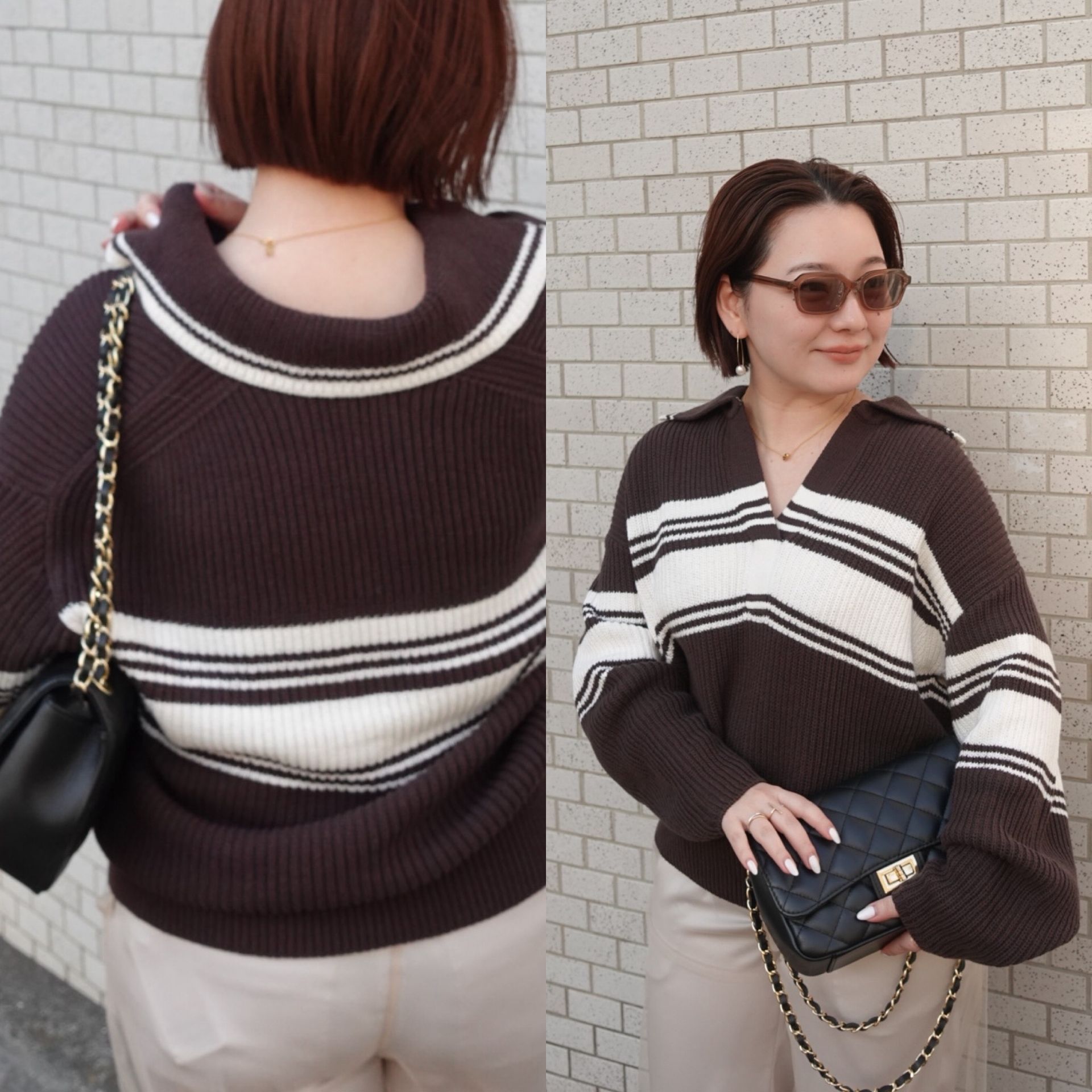 バックスタイルにはセーラーカラーを効かせ、カジュアルに寄りすぎない上品な仕上がりに。大人の女性にこそ着てほしい、洗練されたボーダースタイルです。