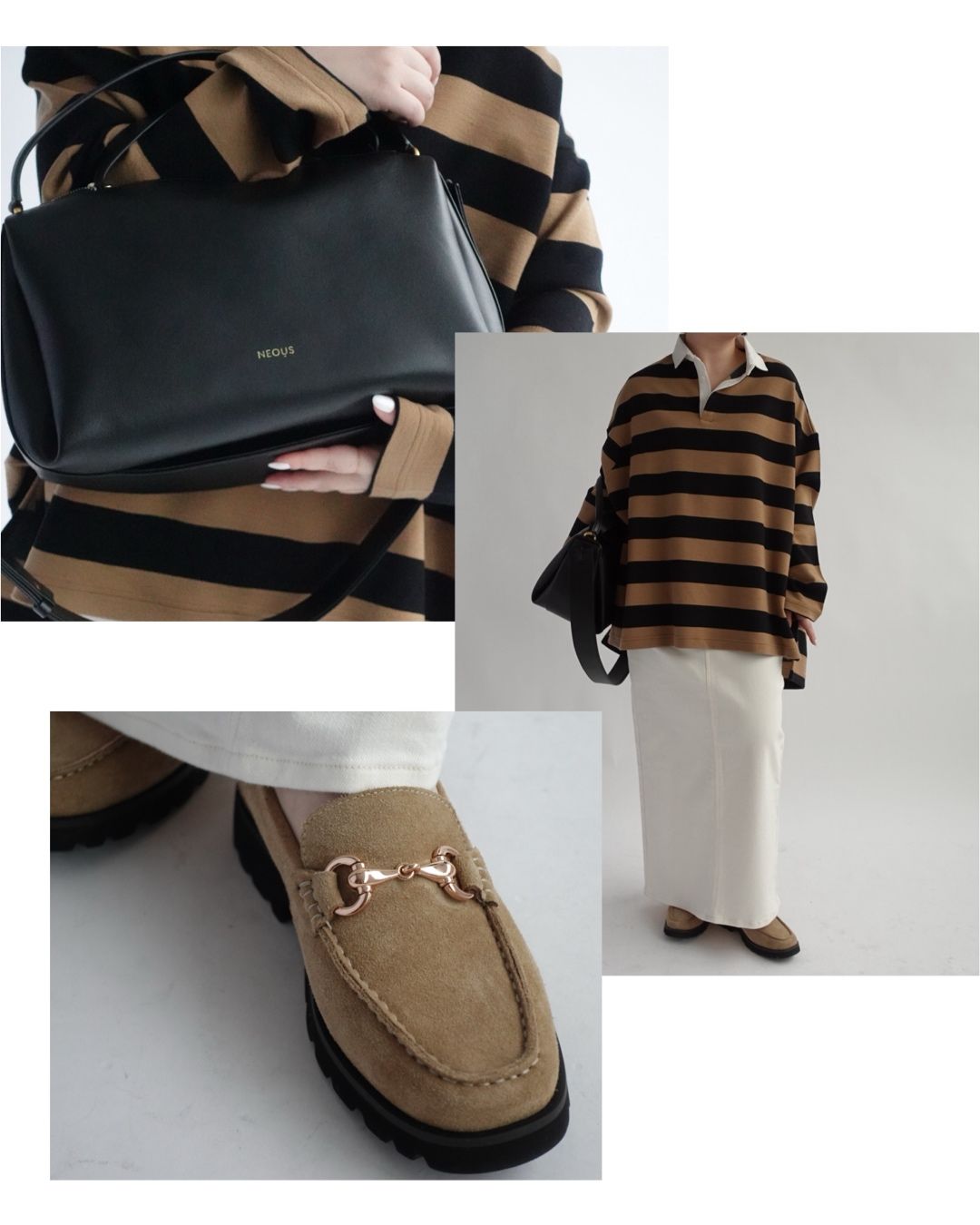 Ladyなタイトスカートとの組み合わせは、クリーンで洗練されたNOBLEらしいスタイリングに。他にはない特別感のあるアイテムに仕上がっています。