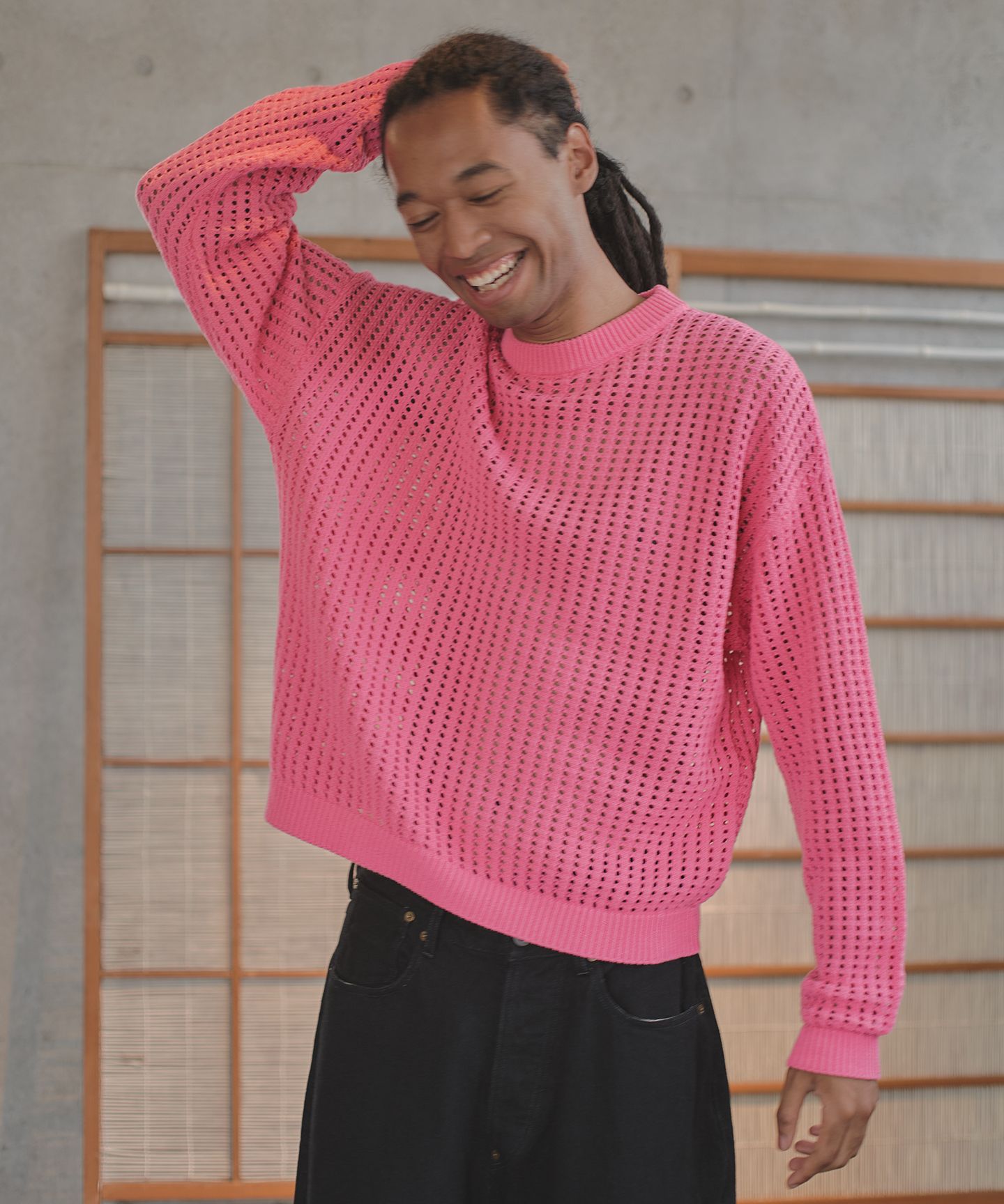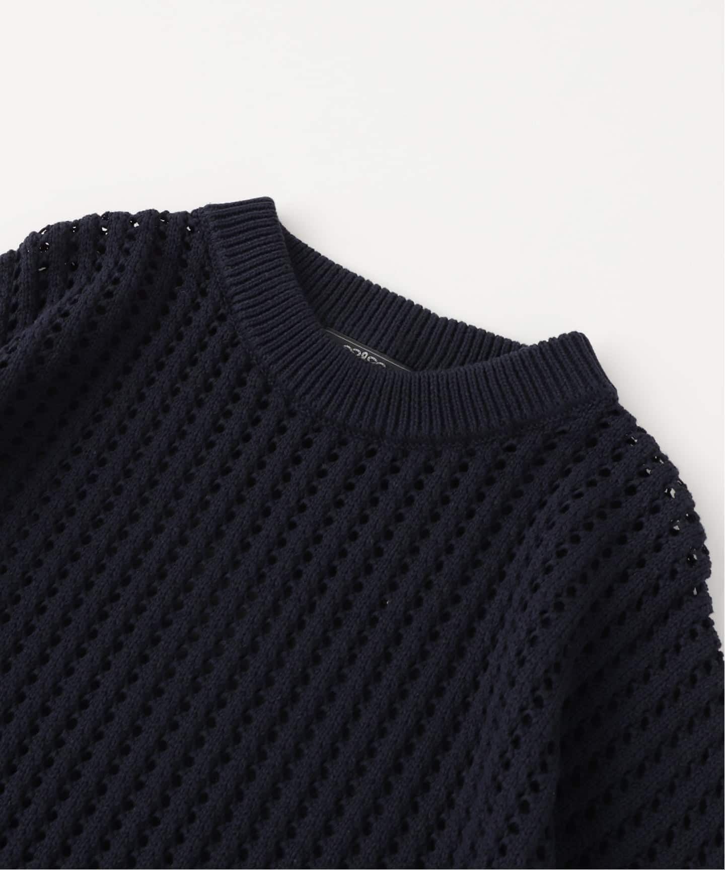 作業現場で使用される安全帯から着想を得てデザインされたメッシュニットセーター。