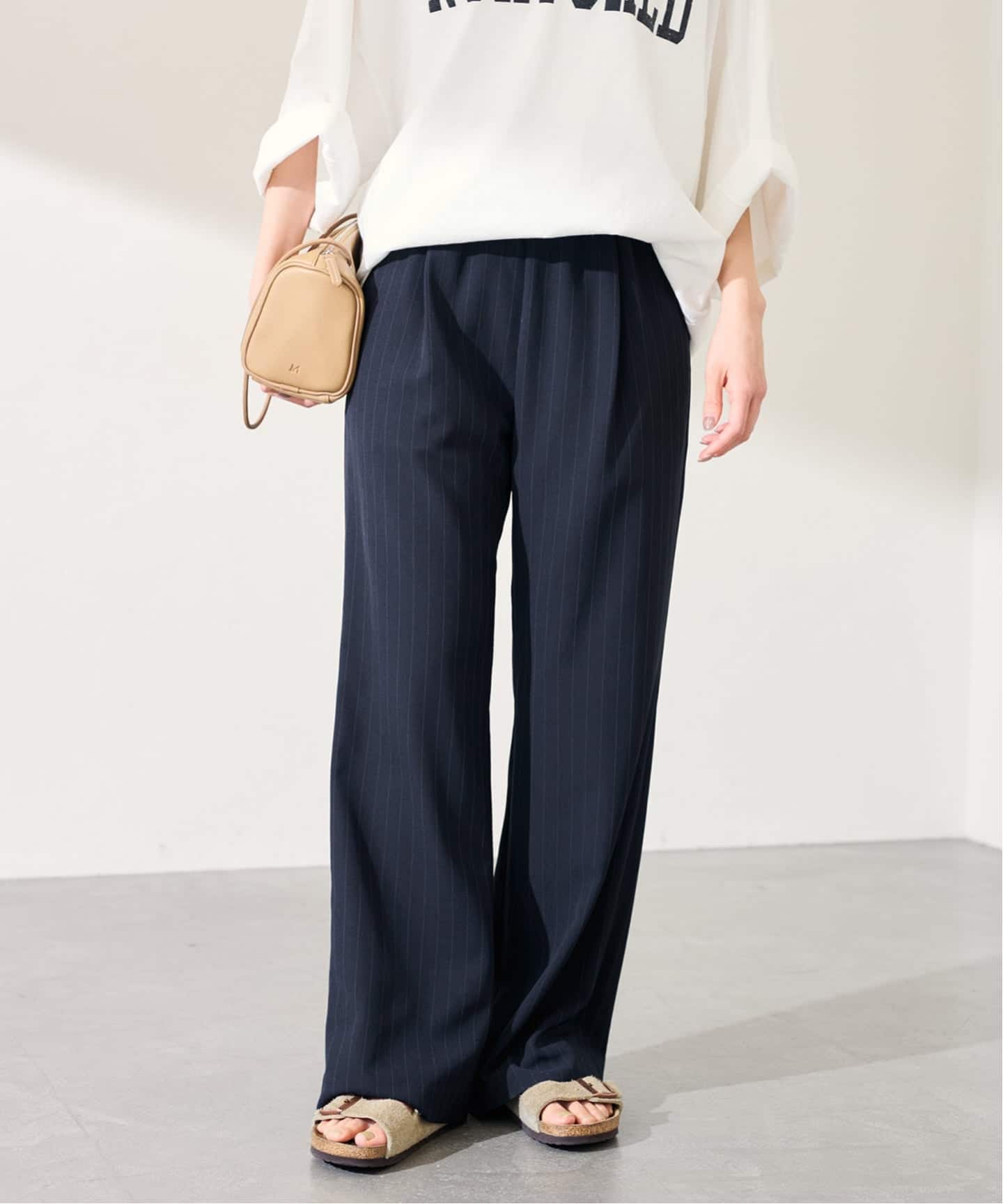 リラックス感漂うイージーパンツながら、タックをとることで腰まわりはすっきり見えるように。