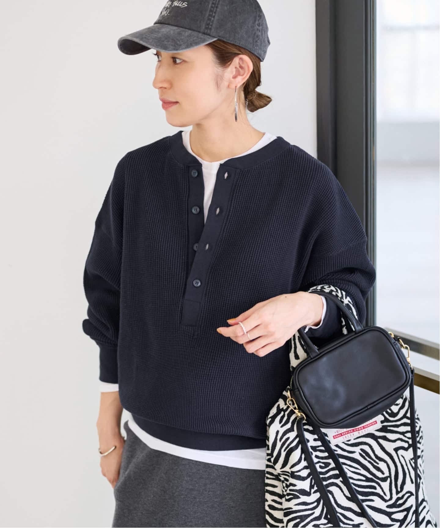 抜け感が出しやすい、ゆったりとしたオーバーサイズのヘンリーネックトップス。