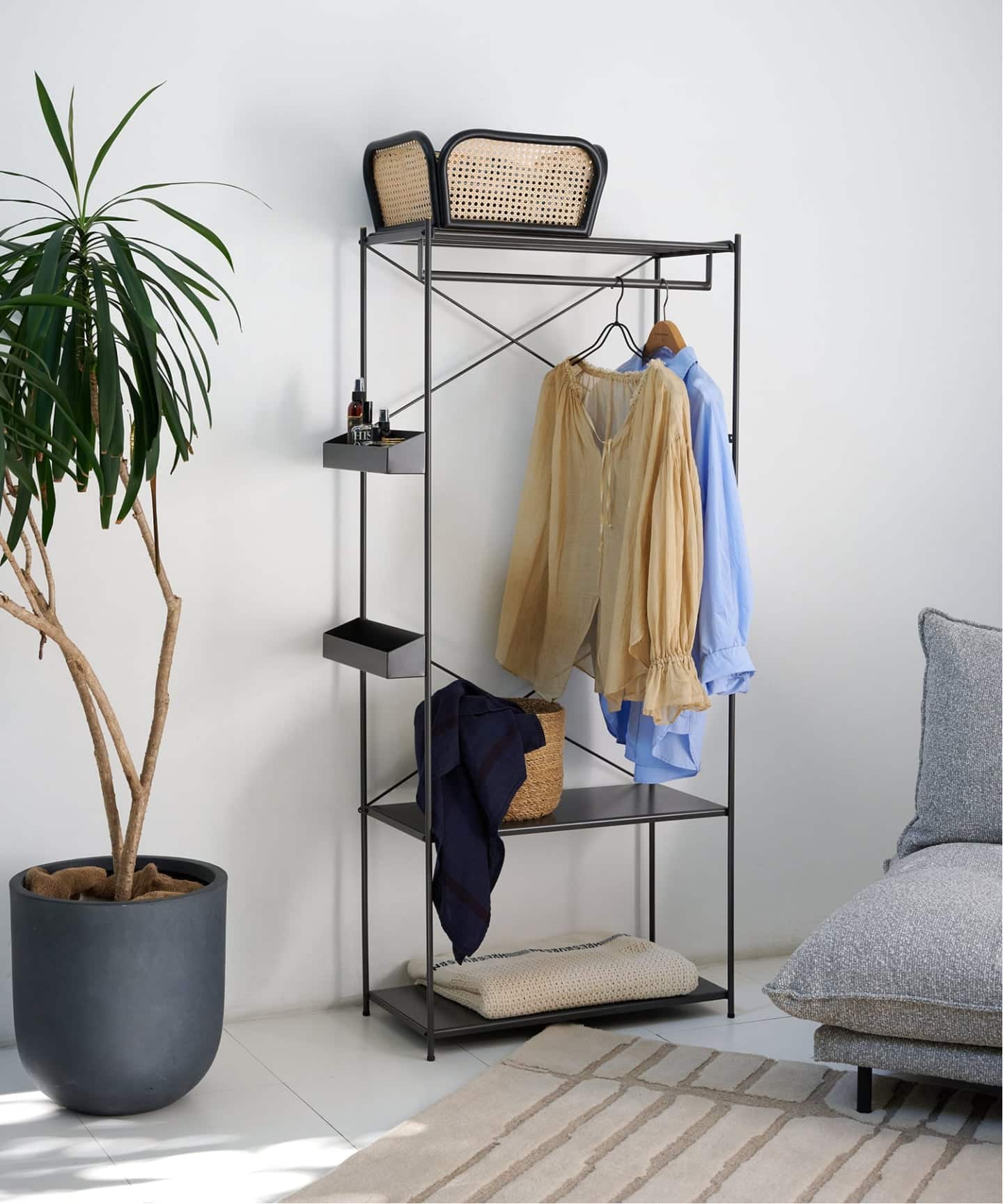 ハンガーラック&シェルフ:見せる収納でおしゃれに整理。棚板の高さ調整も可能。