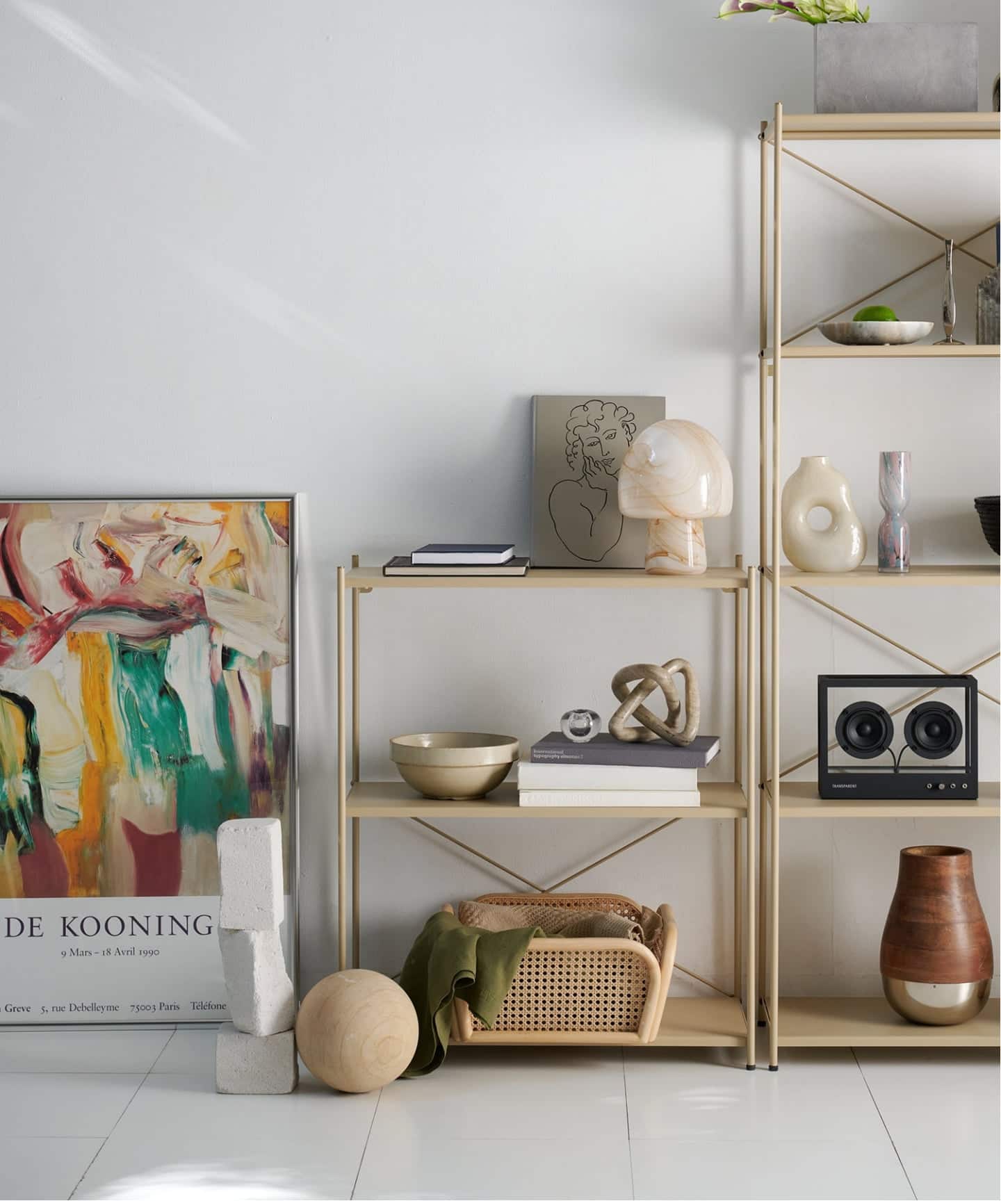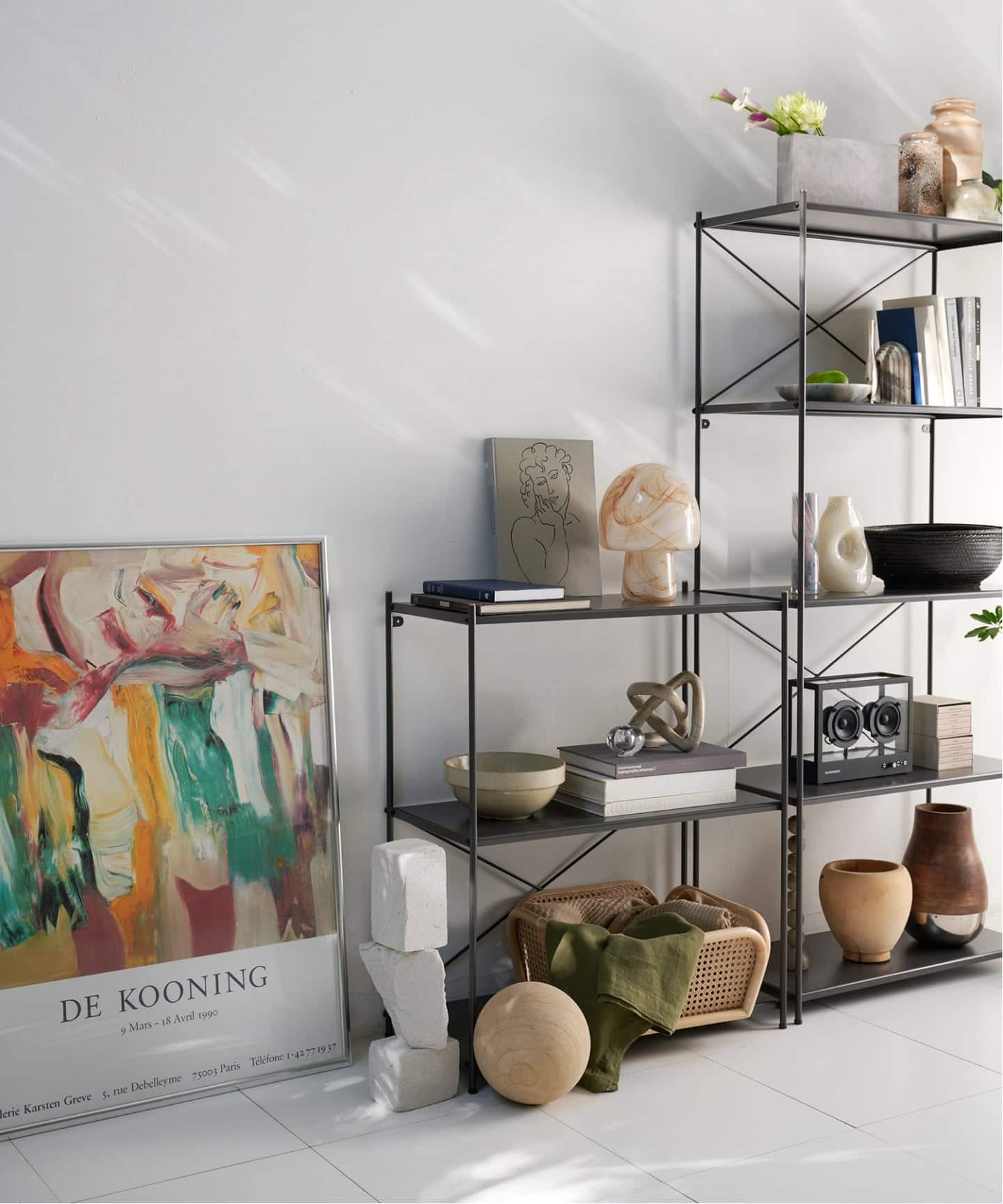 ギャラリー使い:ブックシェルフはガラス棚+抜け感のあるフレームで、壁付けでも間仕切りでも美しく。自然光を取り込んで奥行きを演出できます.