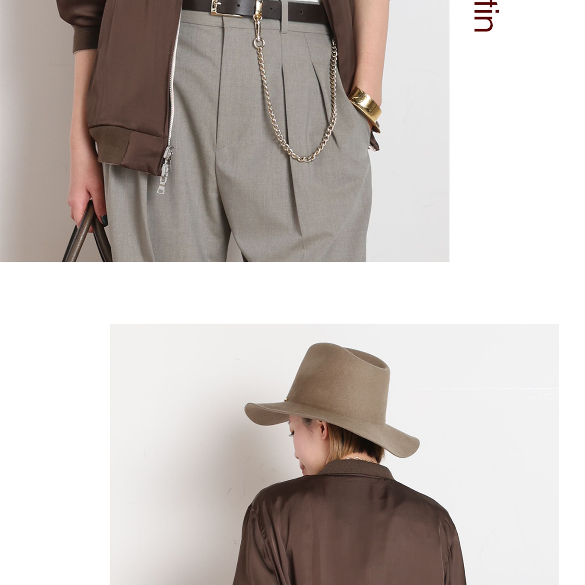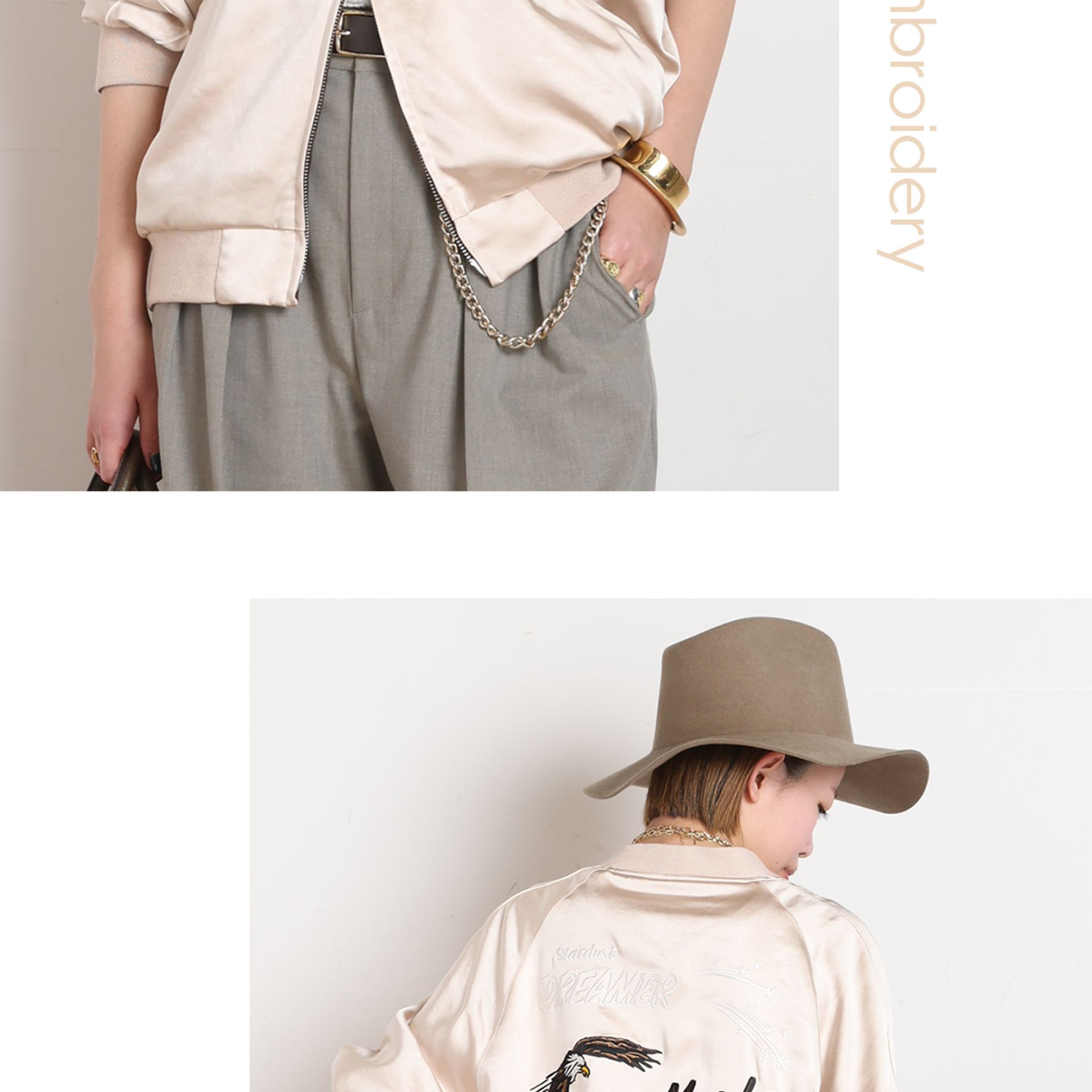 程よい光沢感がスタイリングのポイントになる、ドレスダウンにぴったりな大人のサテンブルゾン。