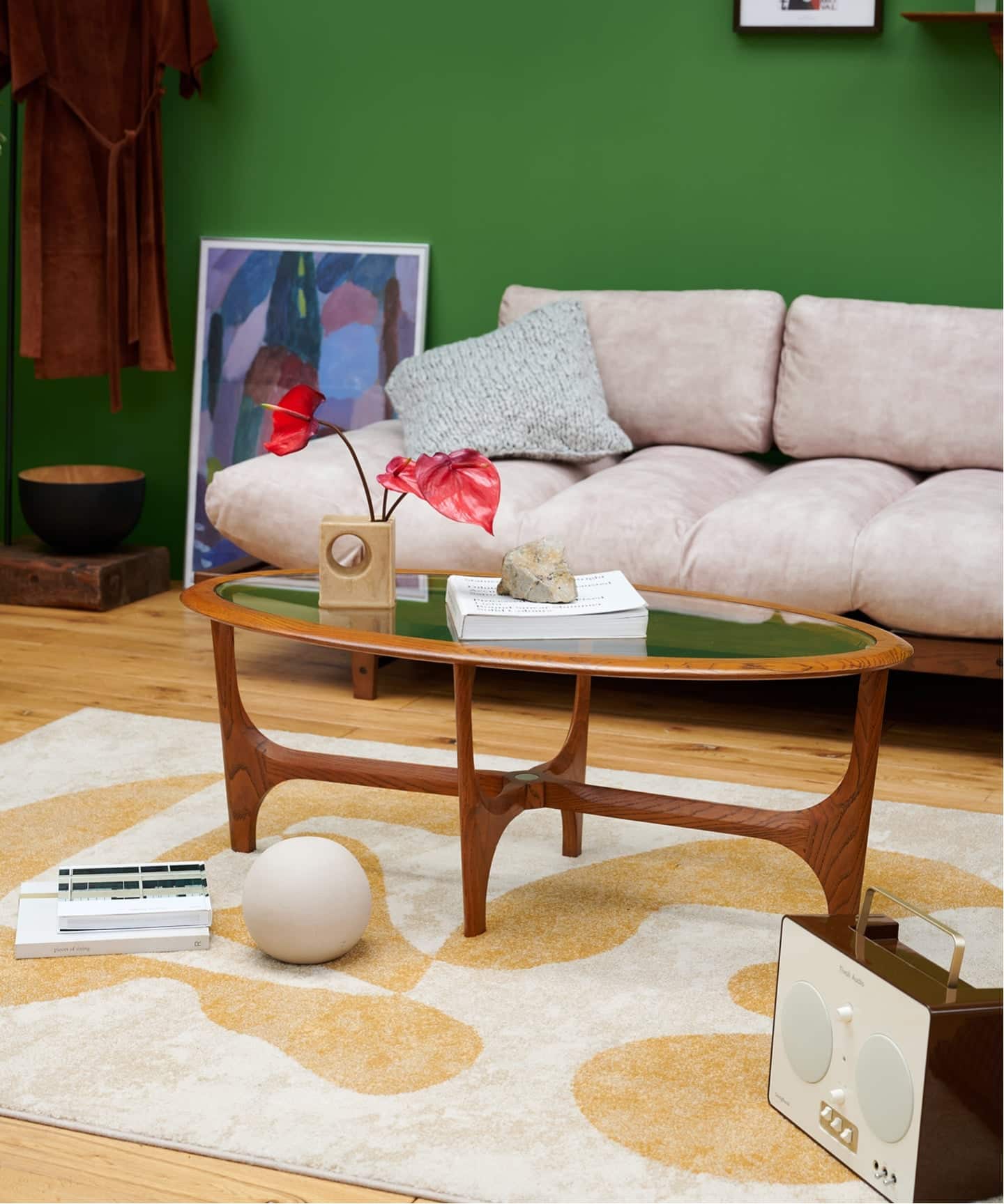 ソファ前のコーヒーテーブルとして、日本の住宅環境に取り入れやすい楕円形サイズに設計。