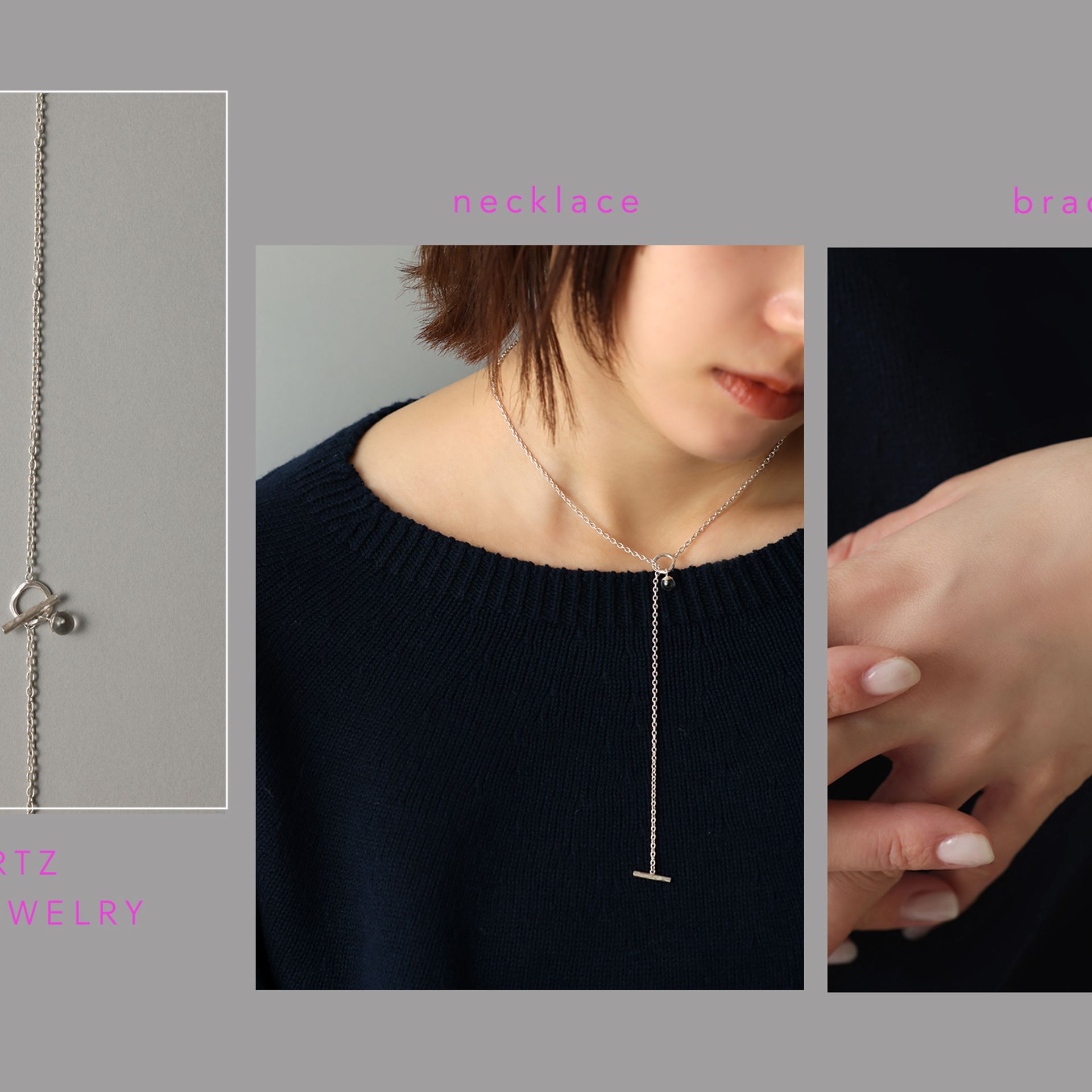 透明感のある人工水晶をあしらったネックレスとブレスレットのシリーズ。