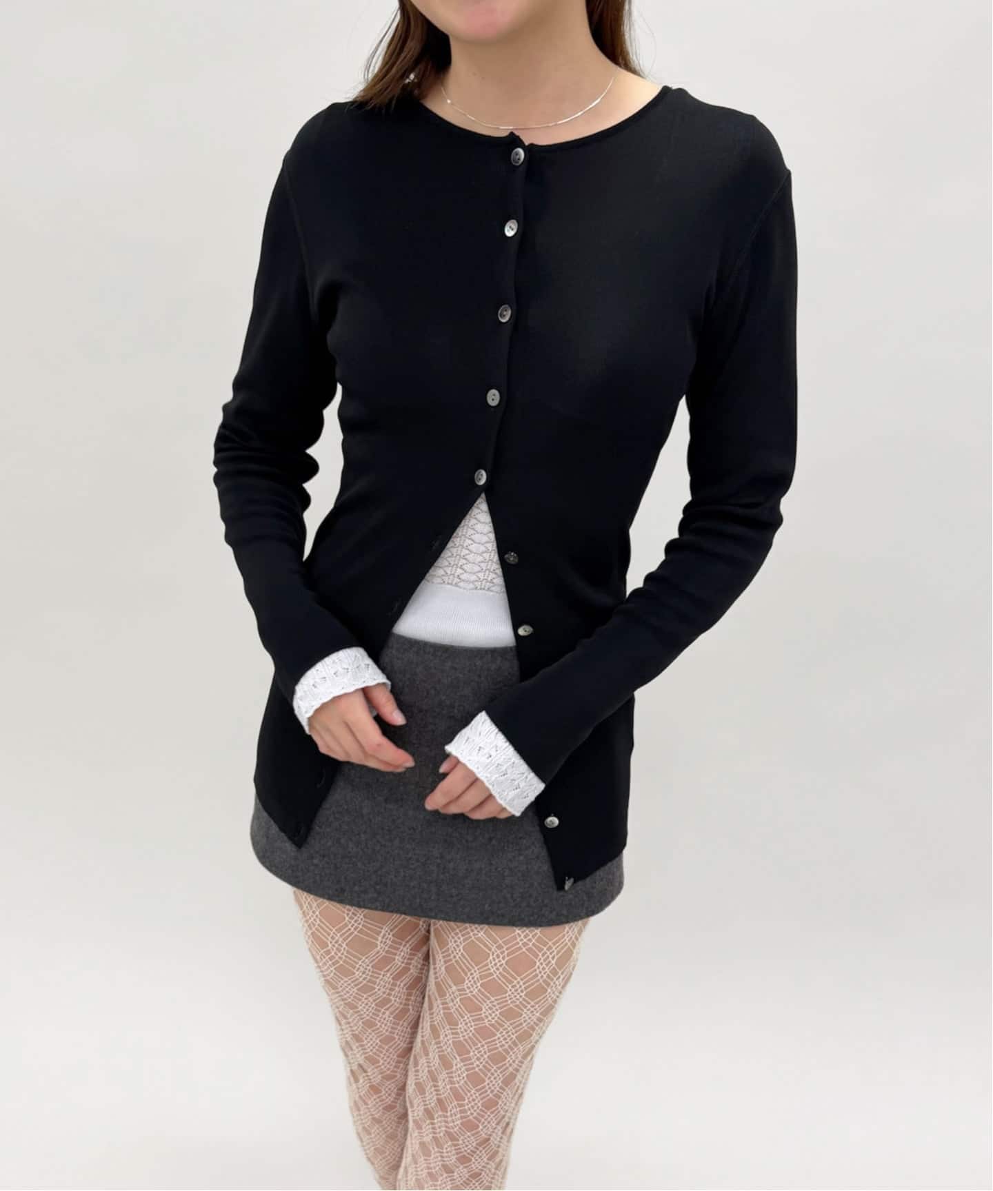 そして小さい黒蝶貝のボタンが多めについているので、縦のラインが強調され、スタイルアップして見えやすいカーディガンです。