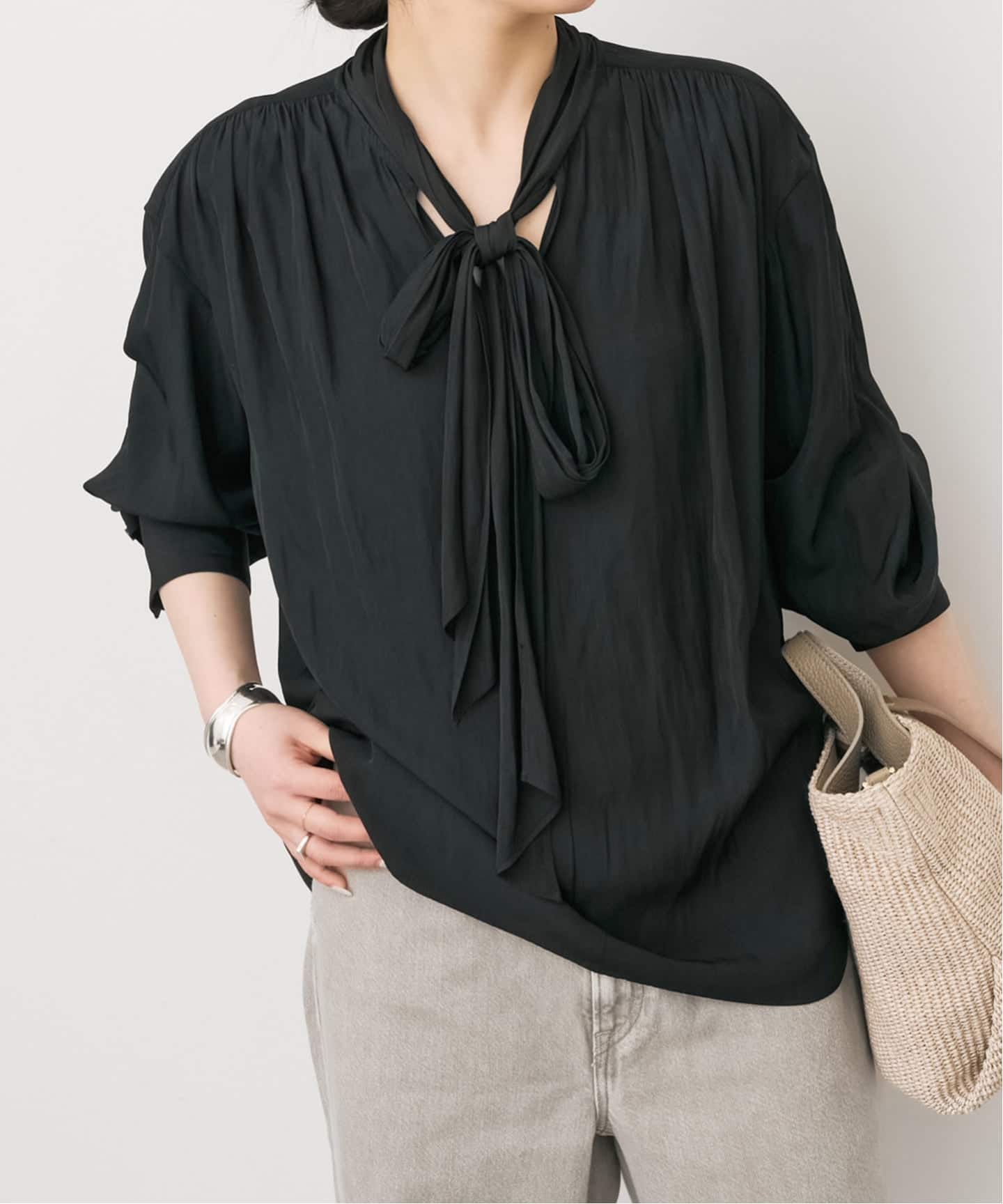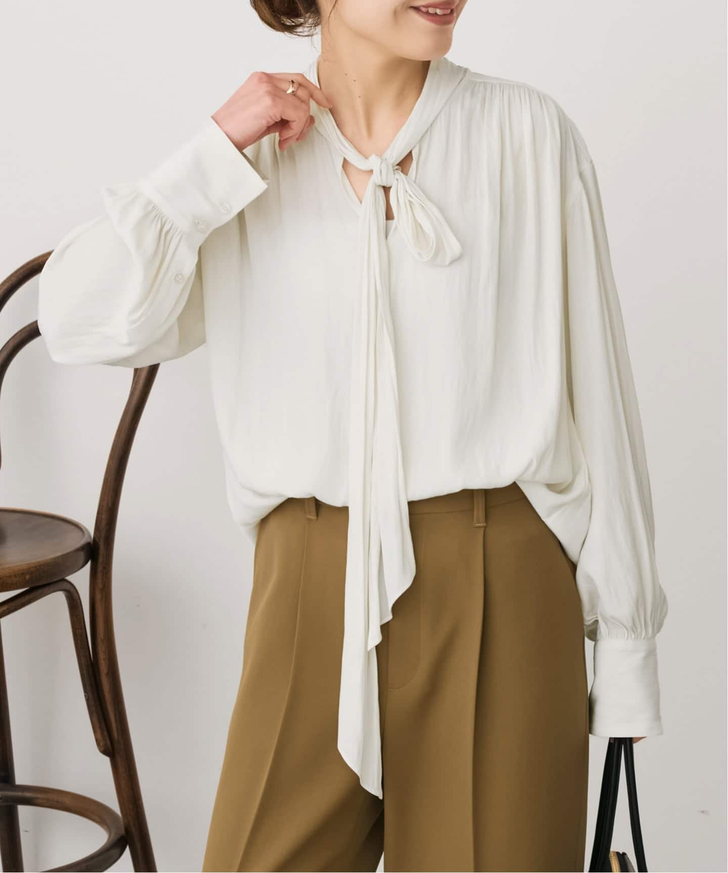 顔まわりを華やかに見せてくれるボウタイデザイン。