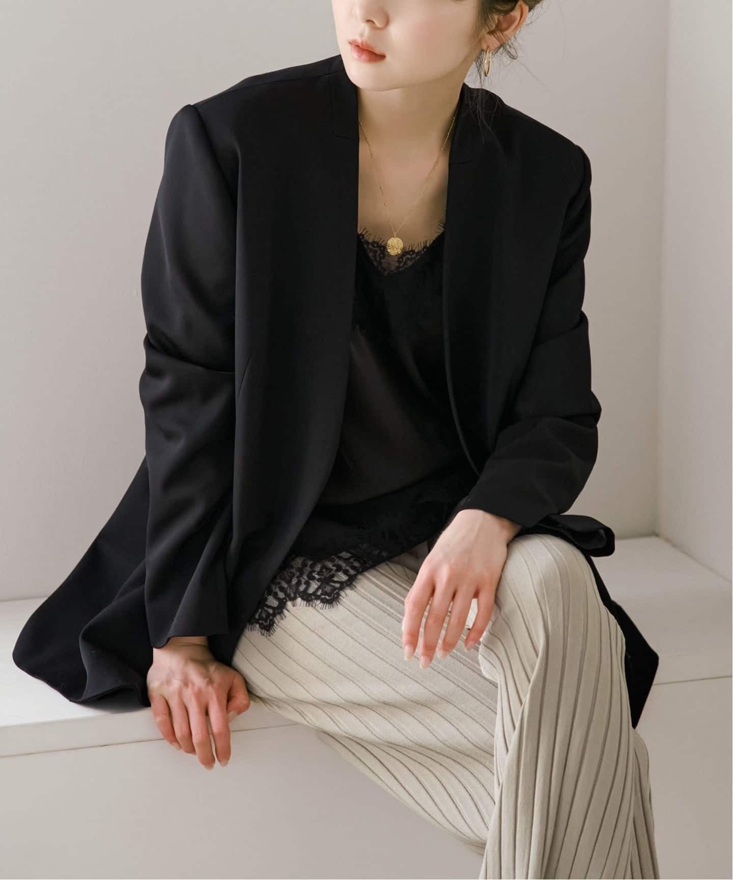 羽織るだけでグッと洗練された印象になるノーカラータイプ