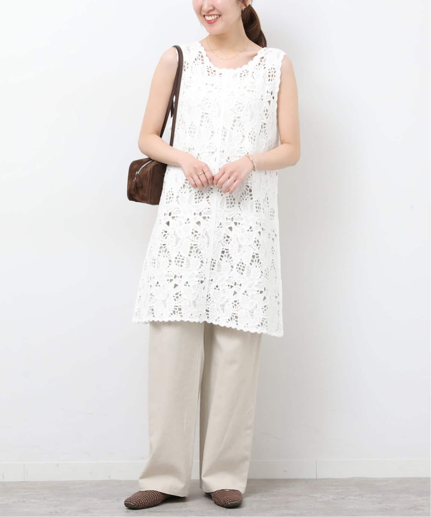 甘くなりがちなクロシェレースをライトなジャケットとデニムでカジュアルに着こなしました。キレイ目派は同シリーズのパンツやIラインスカートと合わせて、セットアップで着るのもおすすめ。クロシェレースなどのクラフト感のあるアイテムは今年もトレンドの予感!