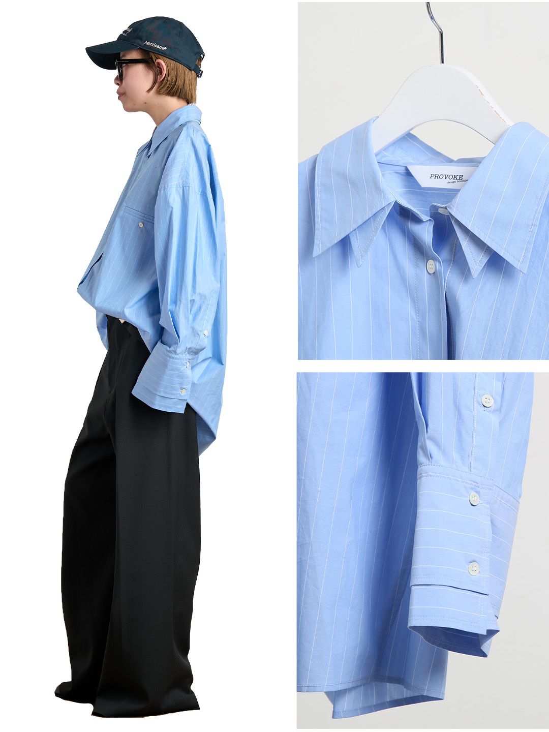 大胆なビッグシルエットに、間隔広めのピンストライプが新鮮で1枚でスタイルが決まる。