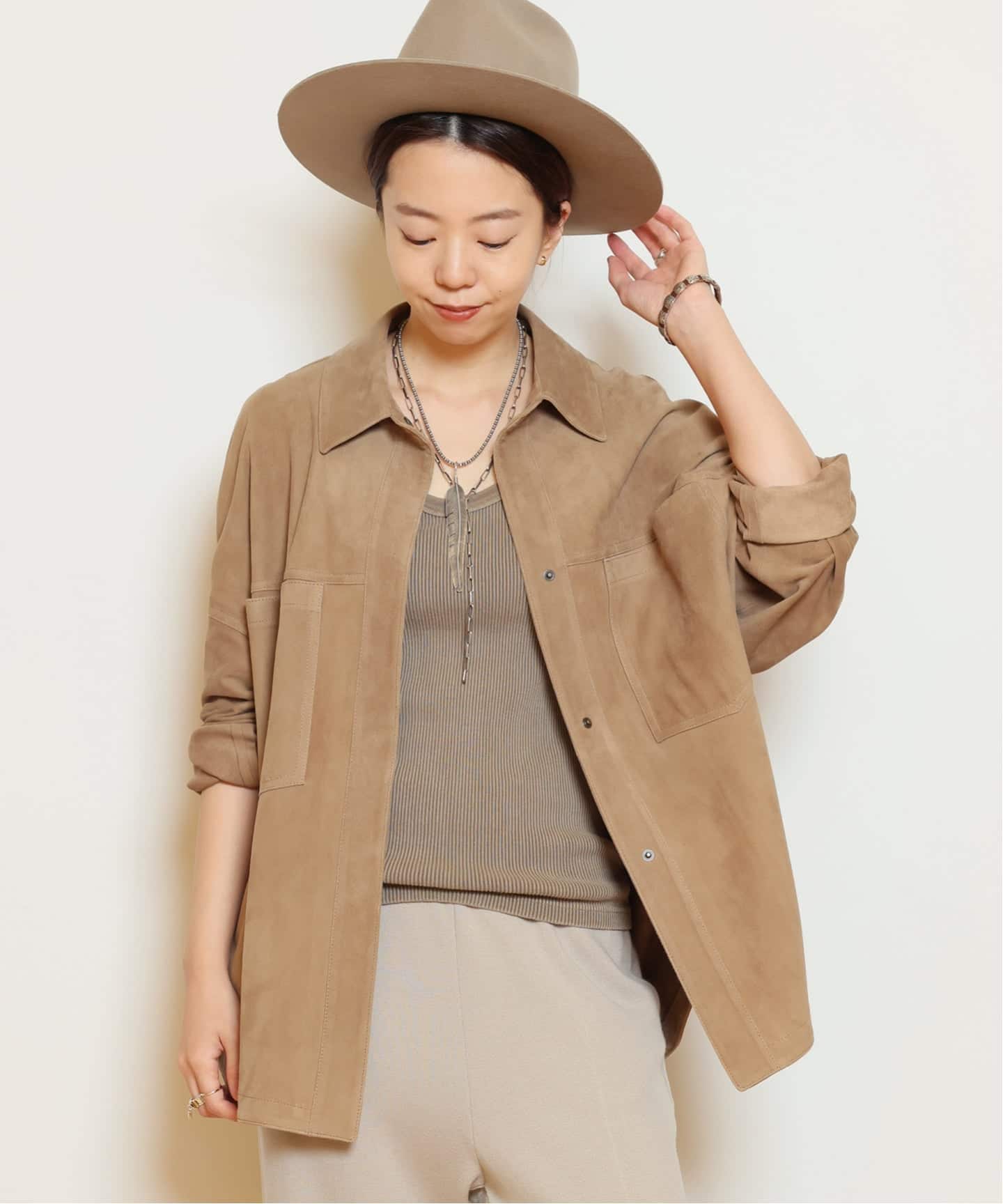 上質さがひと目で伝わる、スエードジャケット。柔らかなベージュの色合いで、春のアウターとしてもぴったりです。