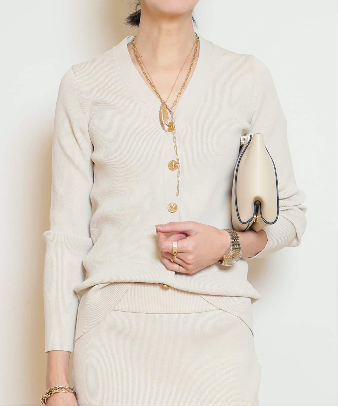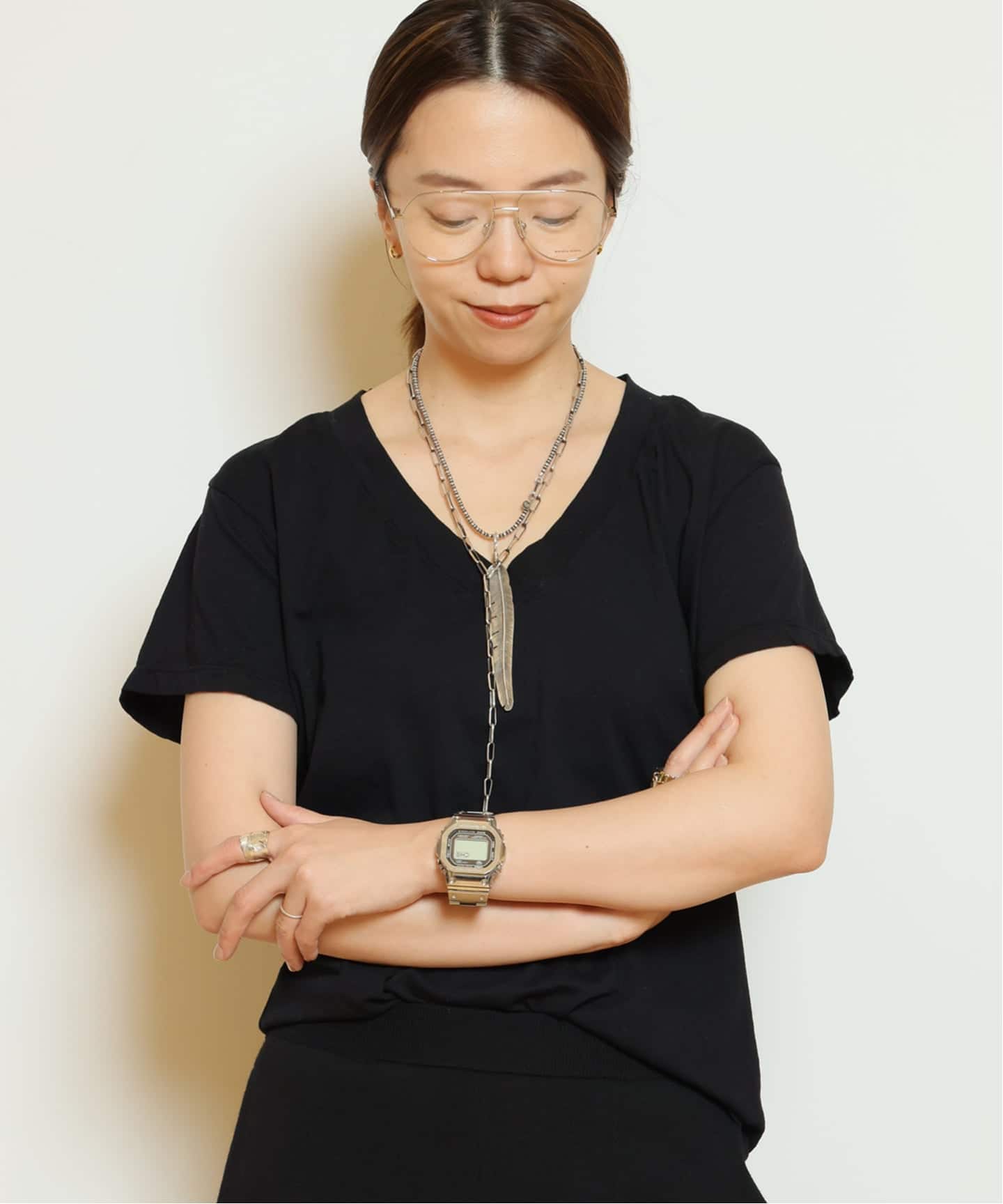 アシンメトリーなカッティングもさりげないポイント。装いにリズムを生む、存在感のあるデザイン。
