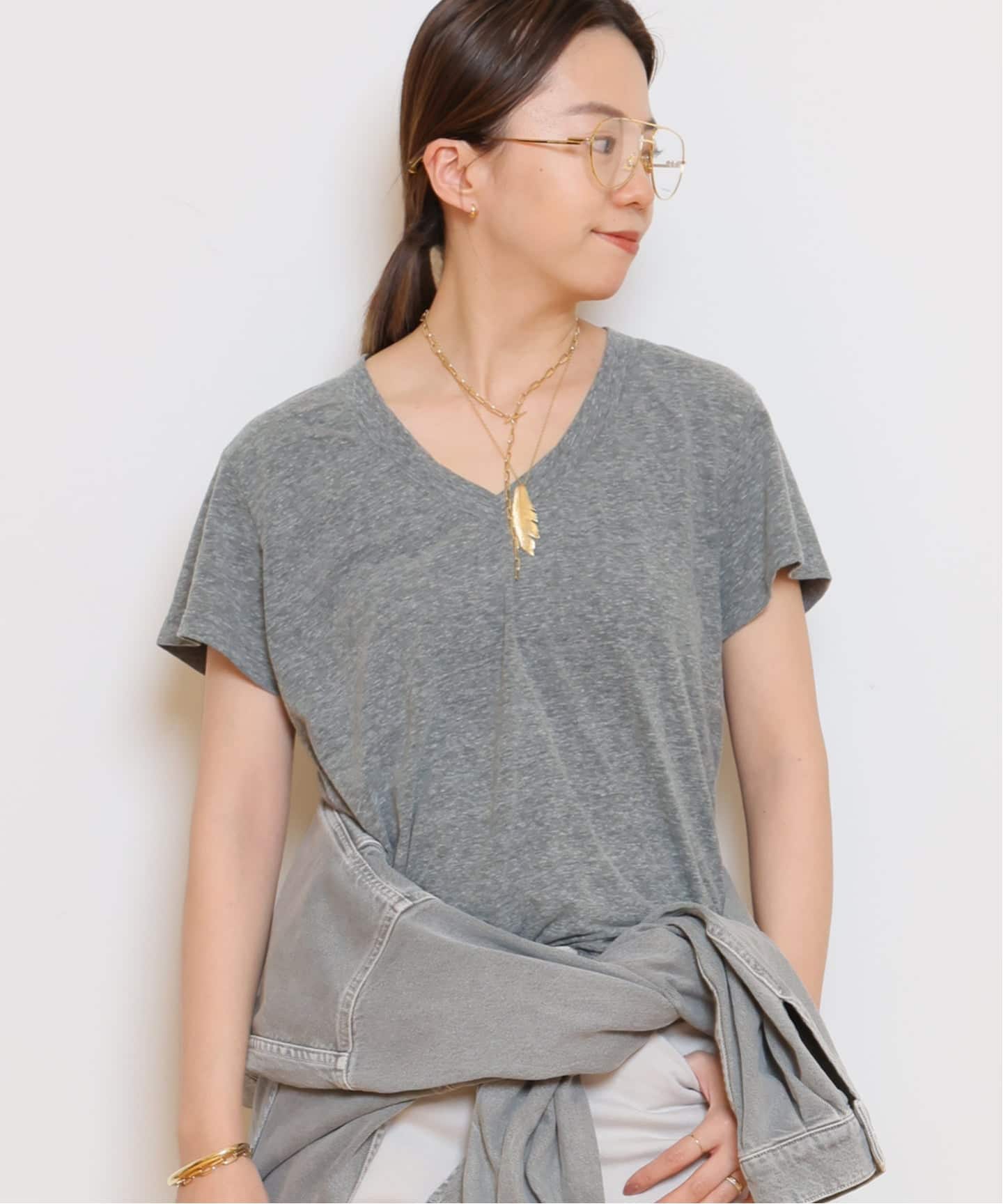 素肌に触れた瞬間にわかる、柔らかく優しい肌触り。程よいVネックの開きに、付かず離れずの美しいシルエット。すべてがバランスよく整い、色違いで揃えたくなる一枚です。