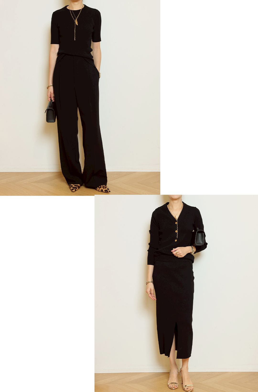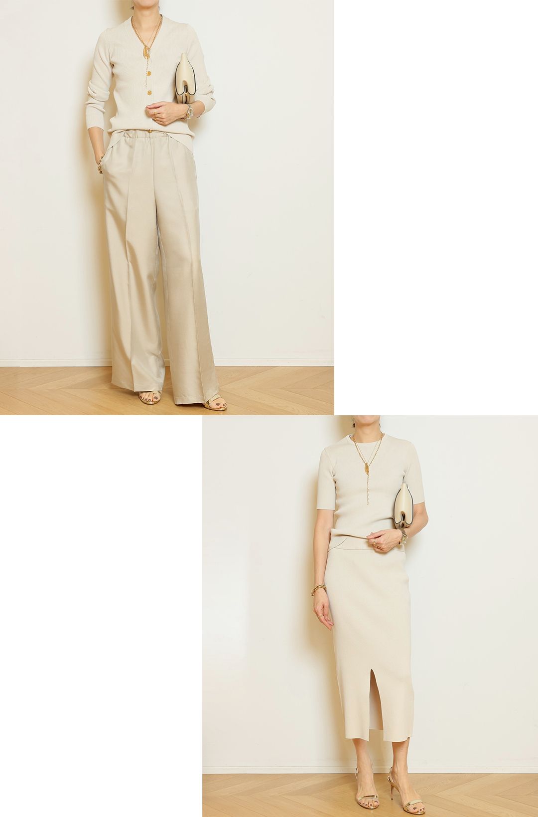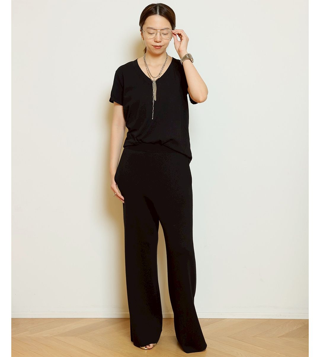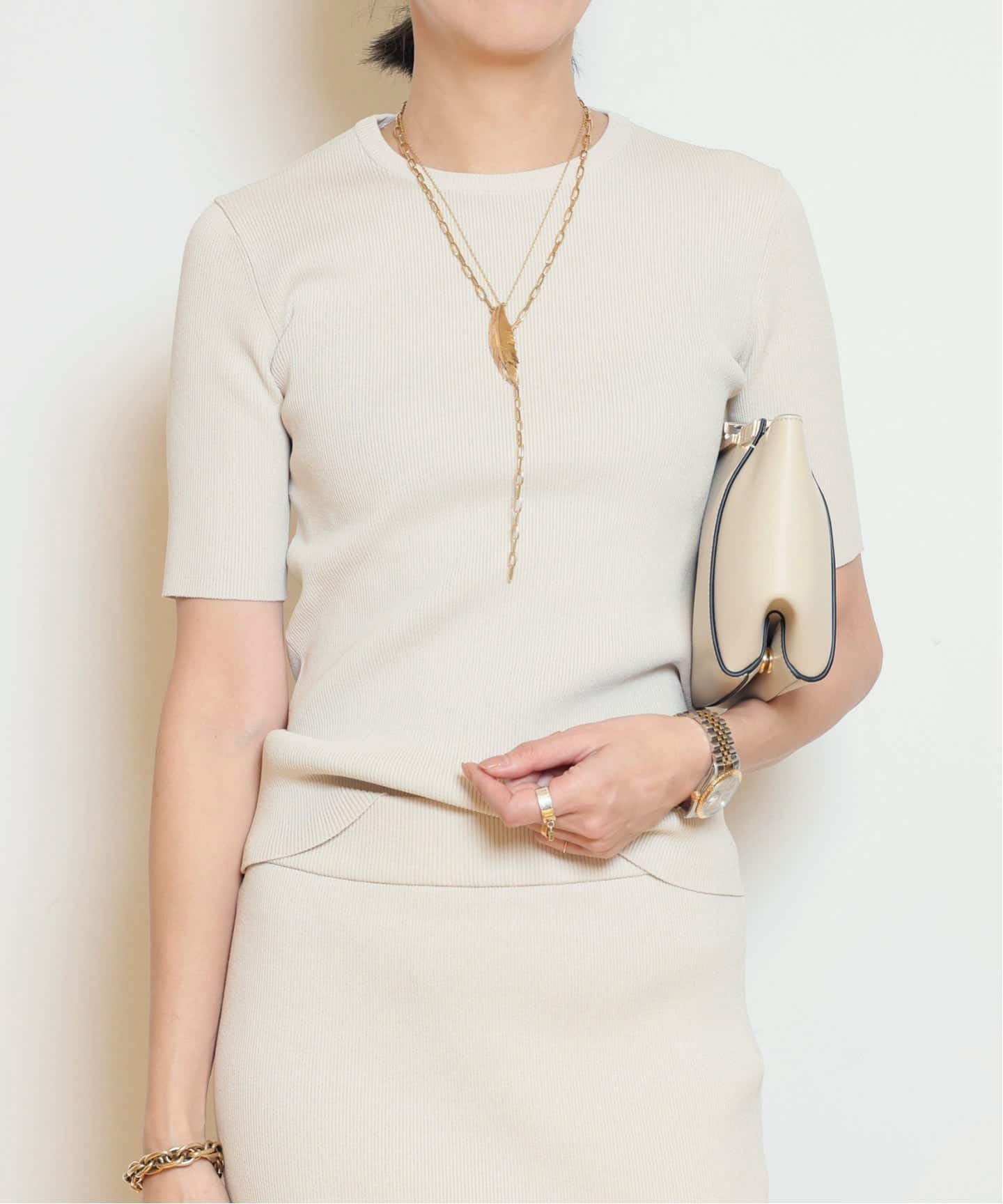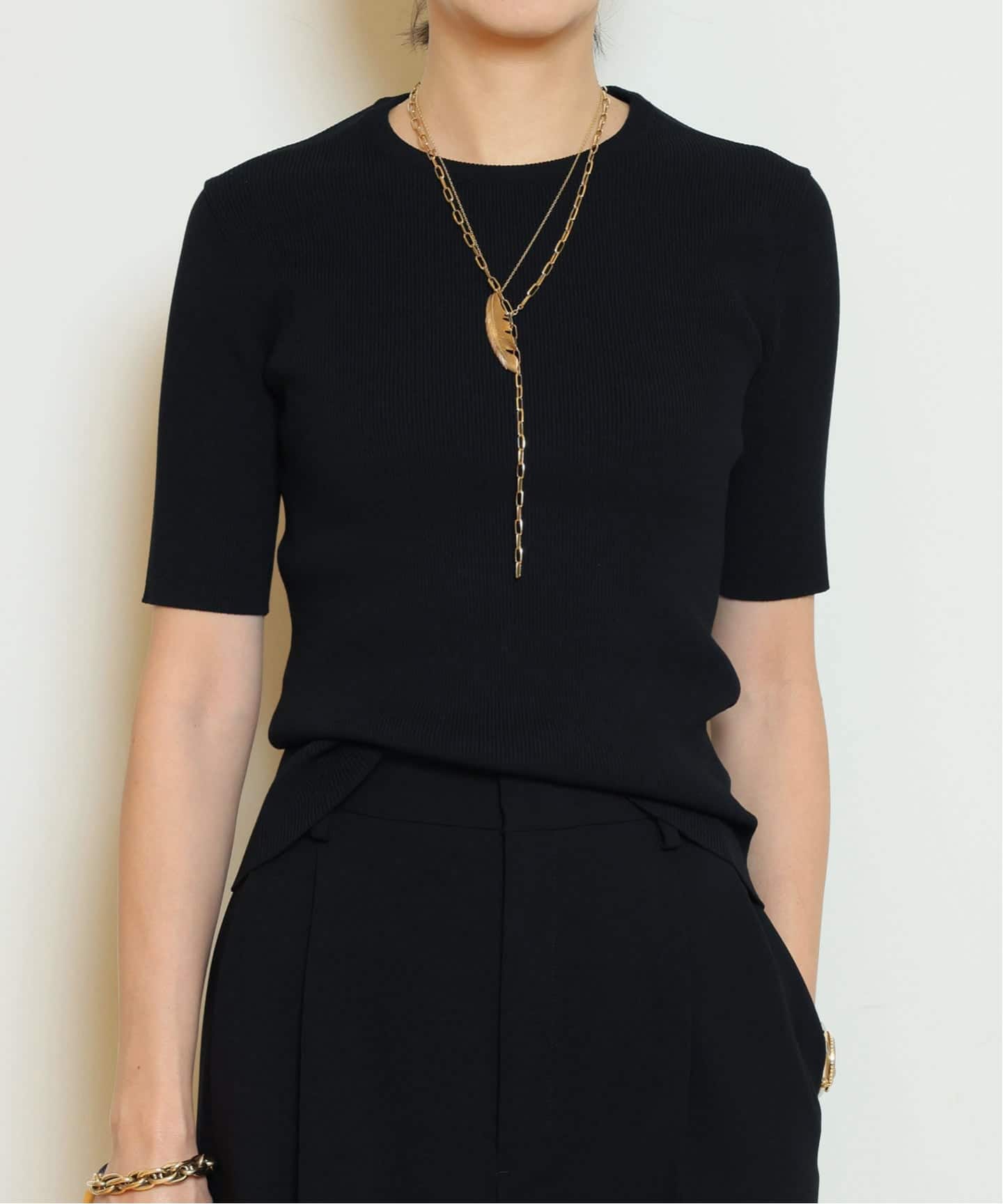 首元はやや詰まり気味に、袖丈は二の腕を自然にカバーし、1枚で品よく決まります。