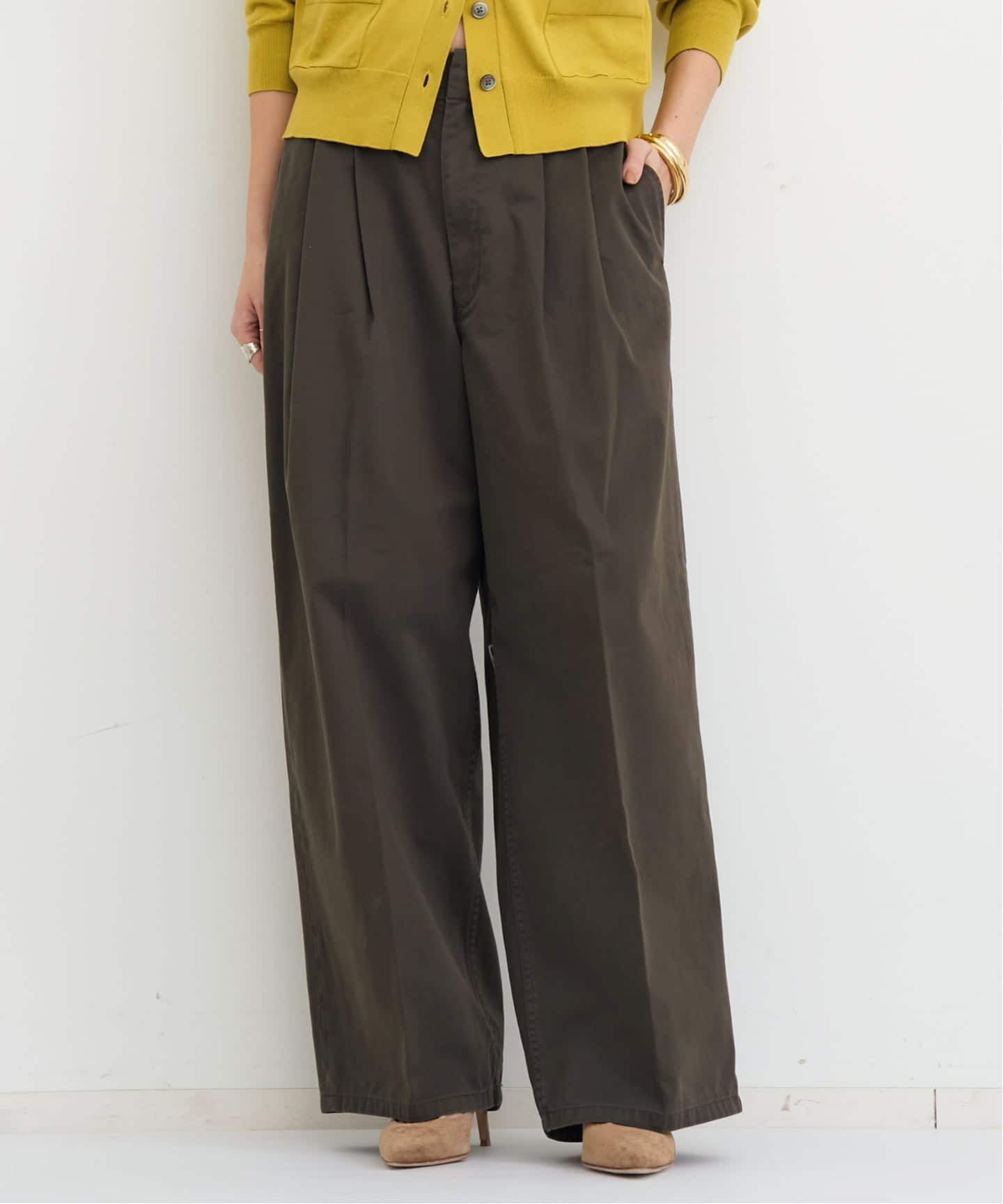 タック入りの女性らしいきれいなシルエットでイエローなどの色物アイテムとも好相性。暖かくなったらTシャツと合わせたりとオールシーズン活躍してくれます。