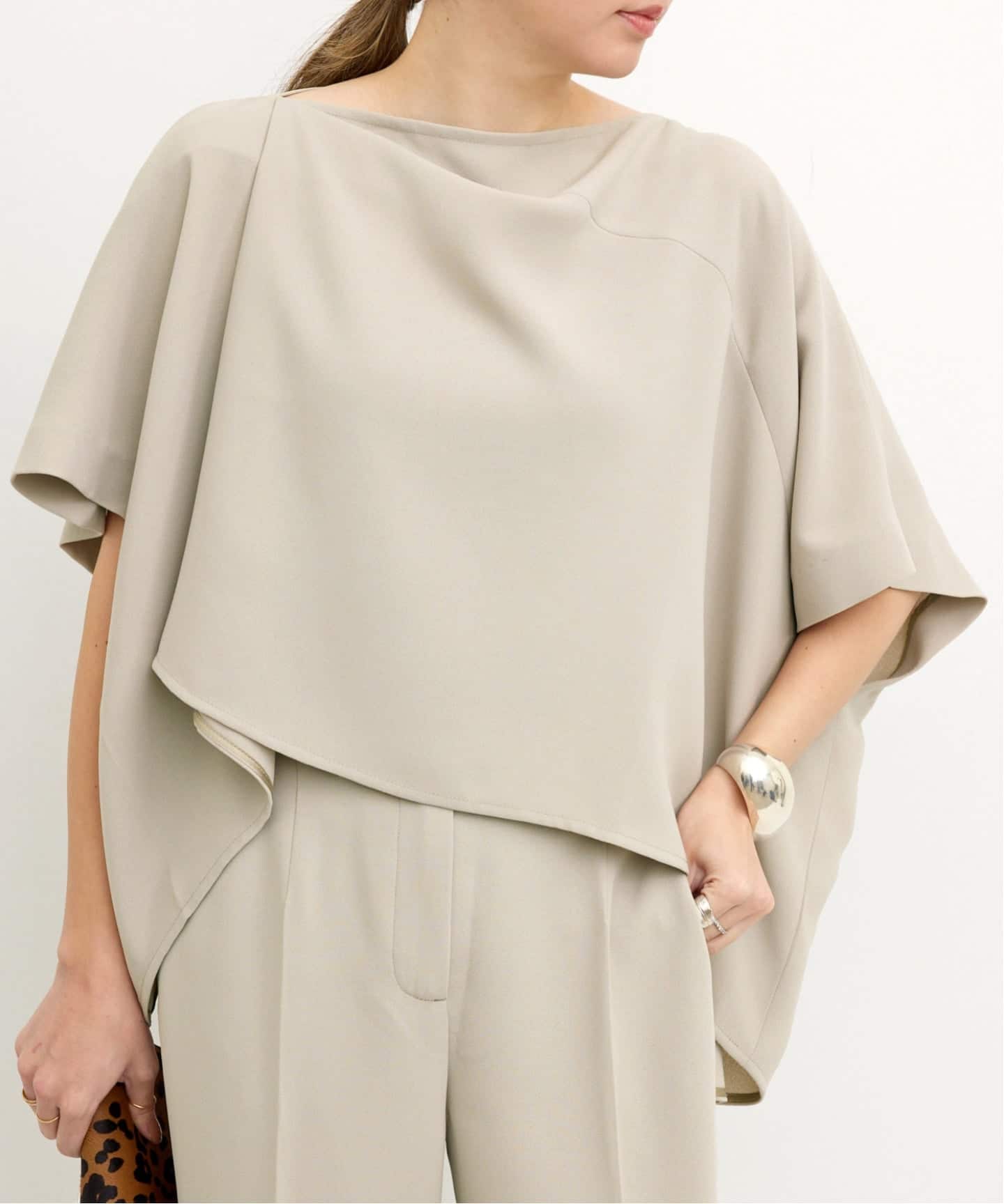 ゆったりとしたシルエットのブラウスは、アシンメトリーなフロントデザインが動きのある優雅な雰囲気に。