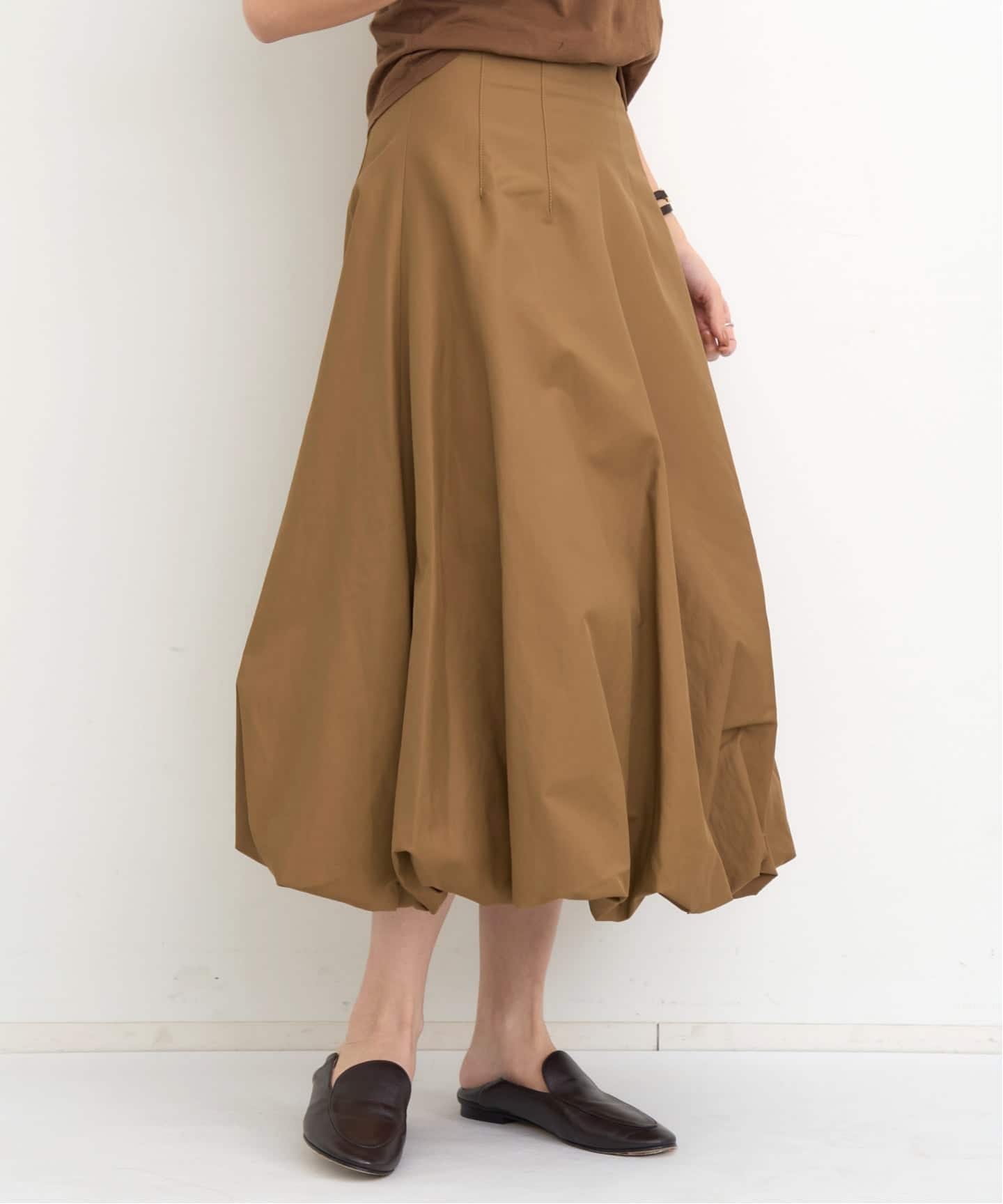 裾にかけてのボリュームが印象的なバルーンスカート。ハリ感のあるコットンナイロンギャバジン素材で立体的なフォルムをキープ。丈夫で汚れにくく撥水性にも優れています。