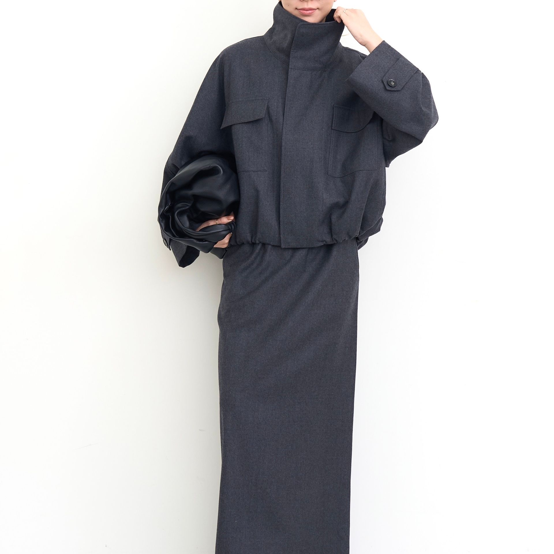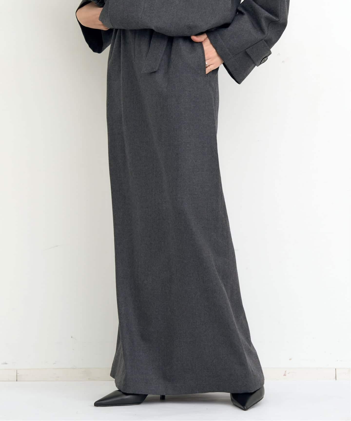 軽くて肌触りの良いウールのジャケットは春先から長い時期活躍してくれます。ロングスカートは無駄のない美しいラインになるように細かく調整しました。ウエストはゴム仕様で穿き心地にもこだわっています。