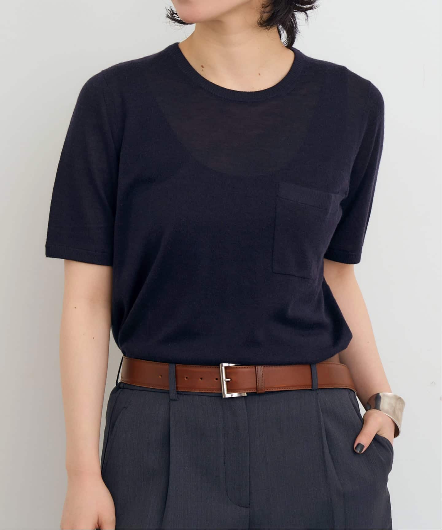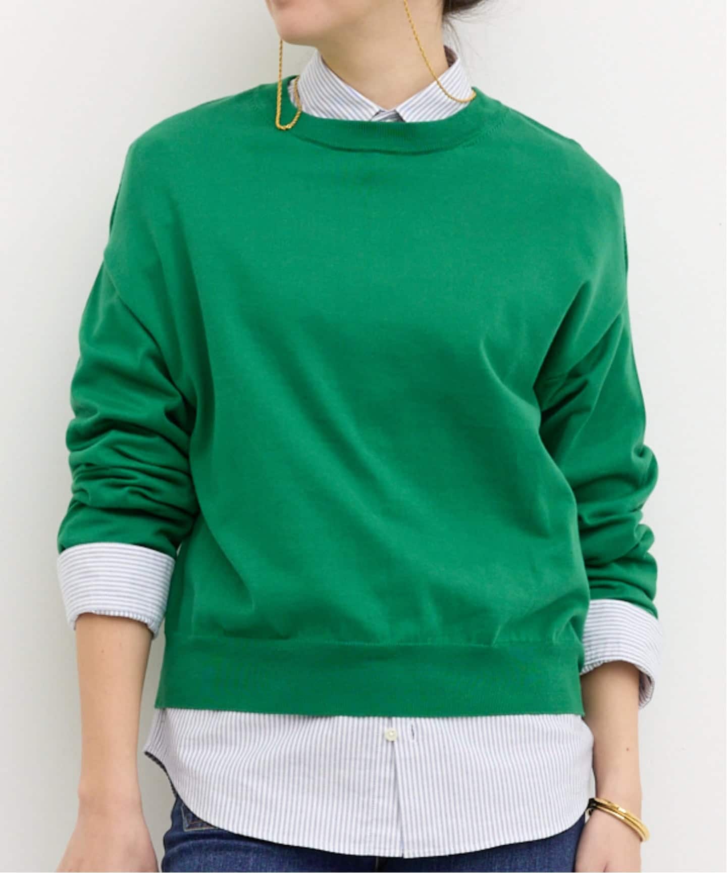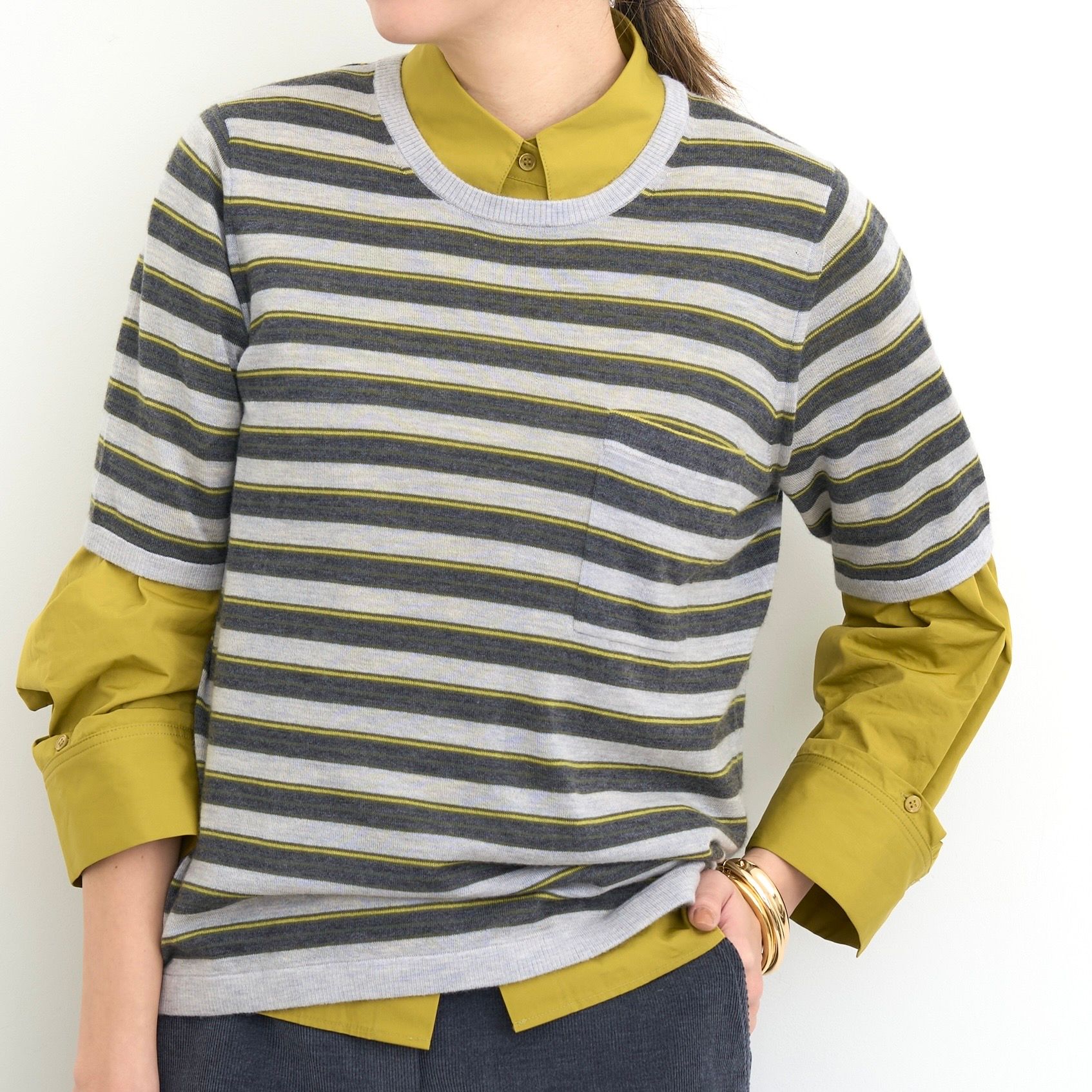 ややクロップド丈のシャツに極細カシミヤのクルーネックニットをレイヤードして、他にはない絶妙なカラーリングを楽しみたい。
