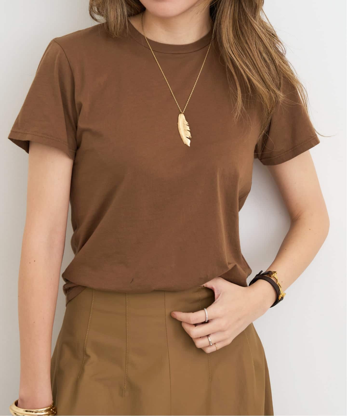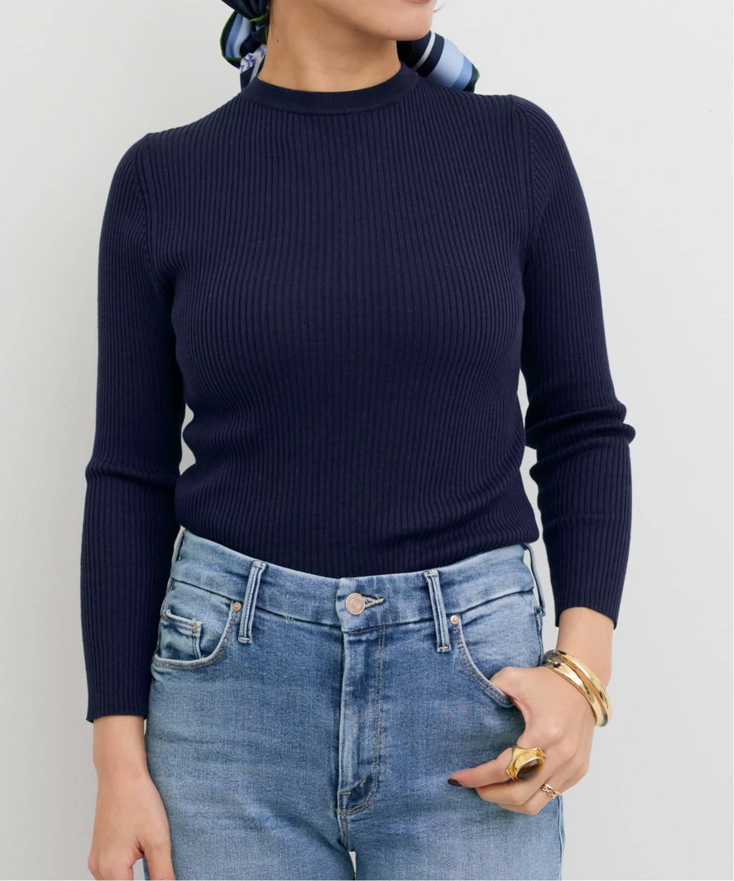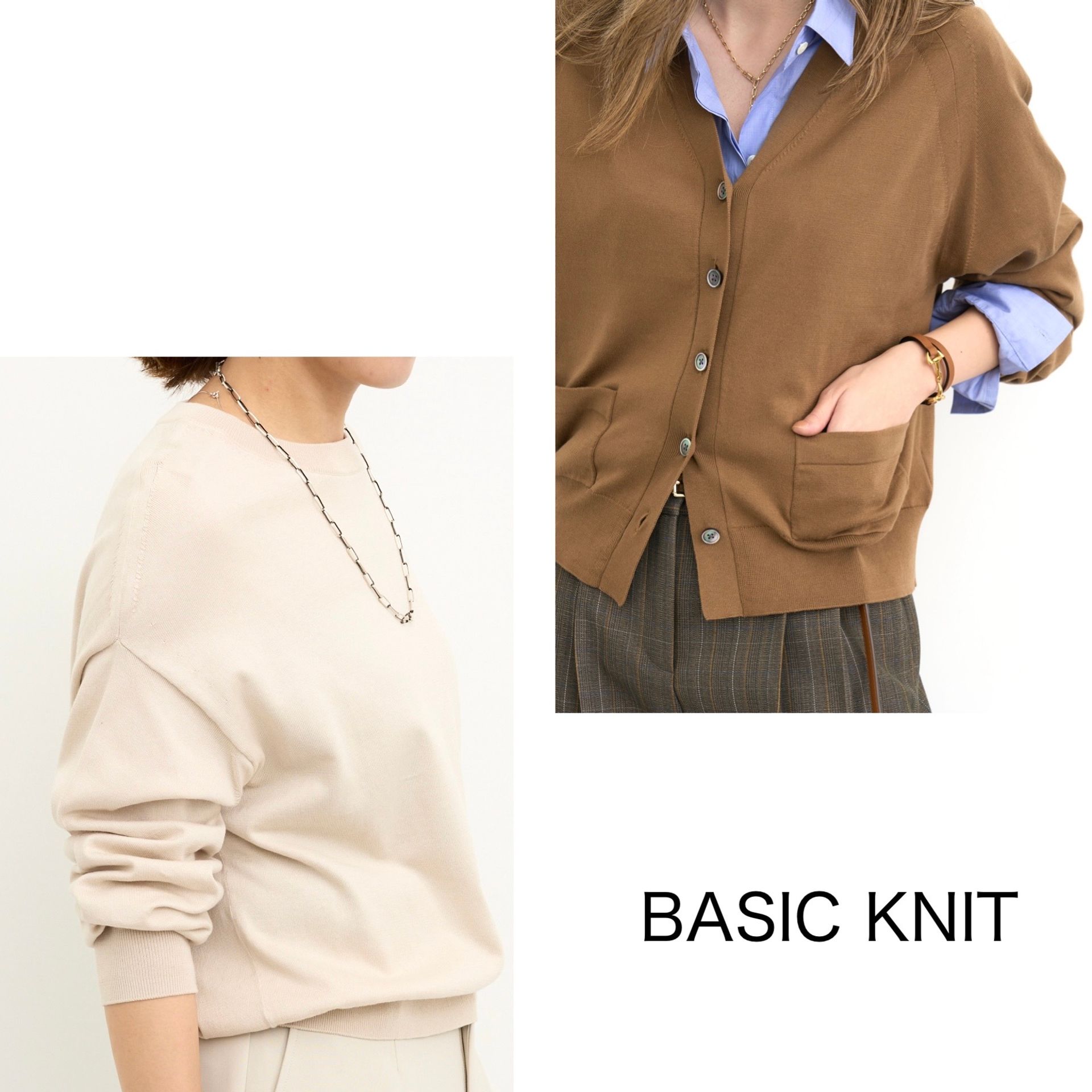 ややクロップド丈のシャツに極細カシミヤのクルーネックニットをレイヤードして、他にはない絶妙なカラーリングを楽しみたい。