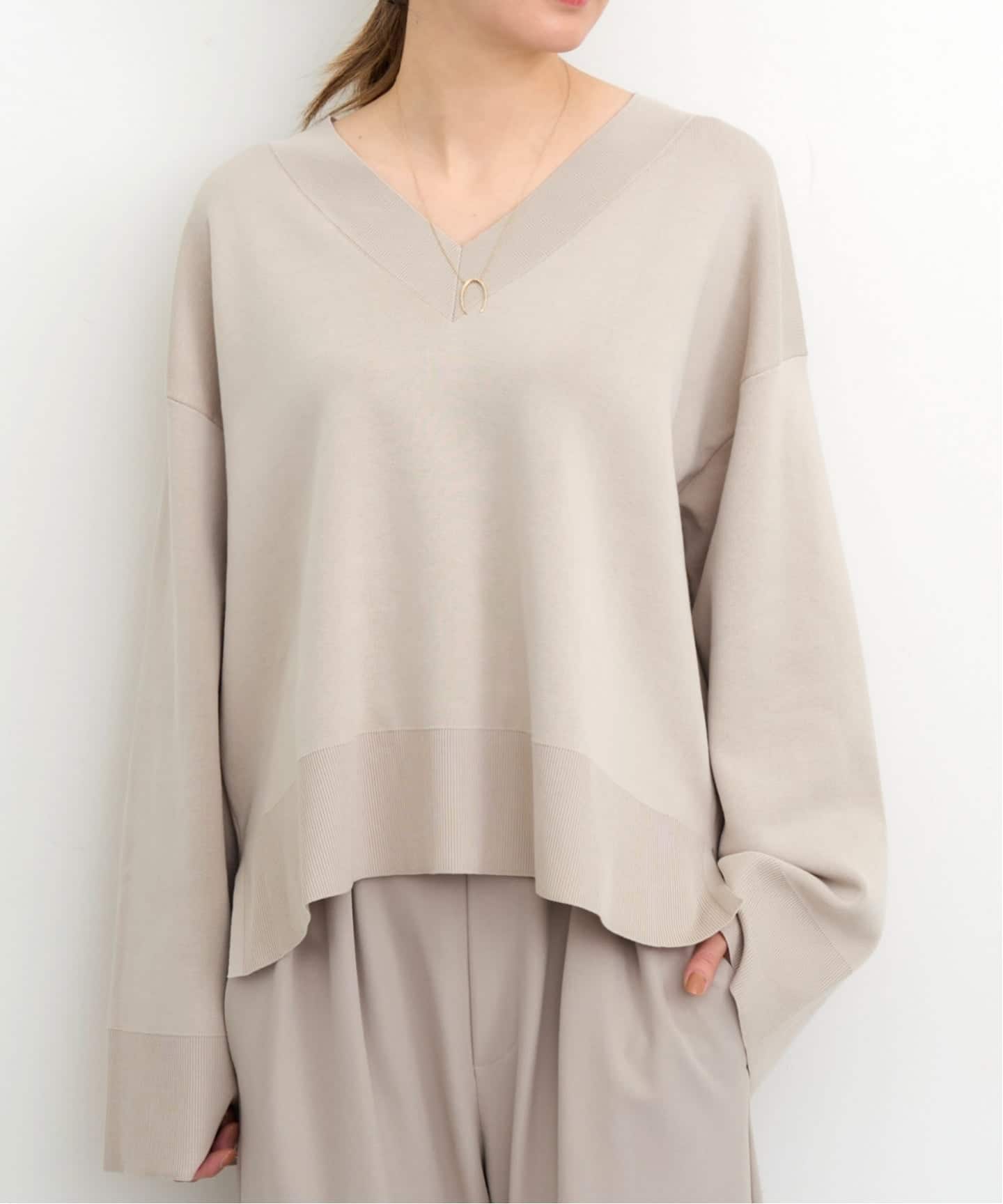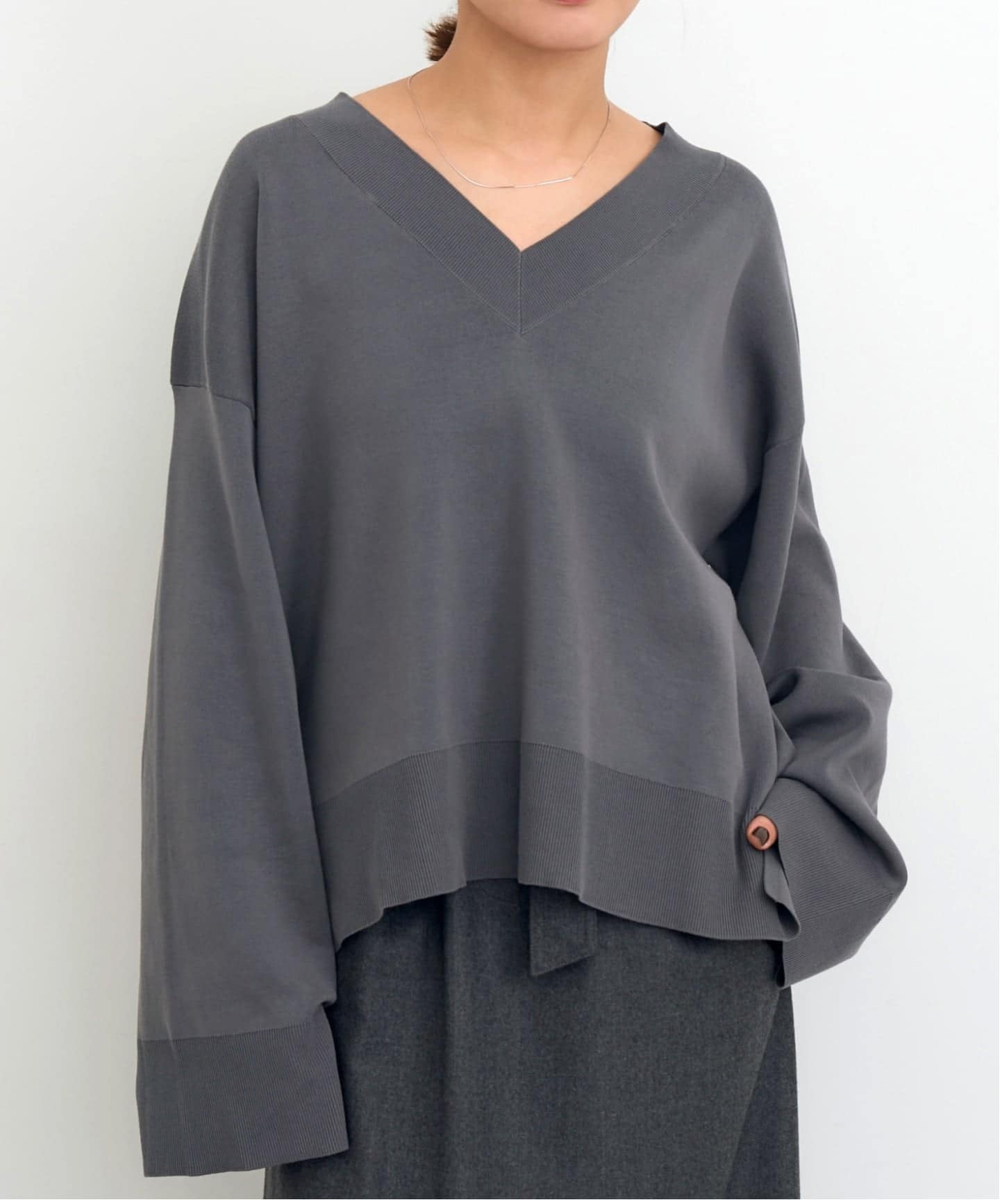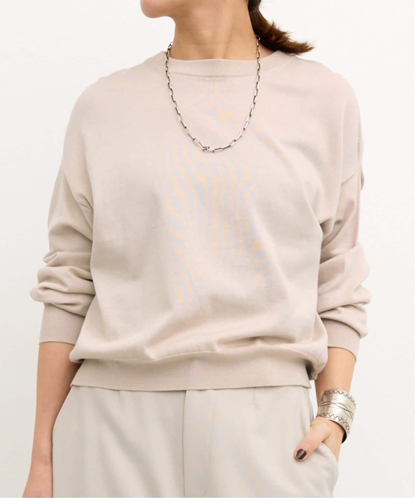 ワイドスリーブのデザインとややゆったりとしたサイズ感のシンプルながら味のあるスムースニット。