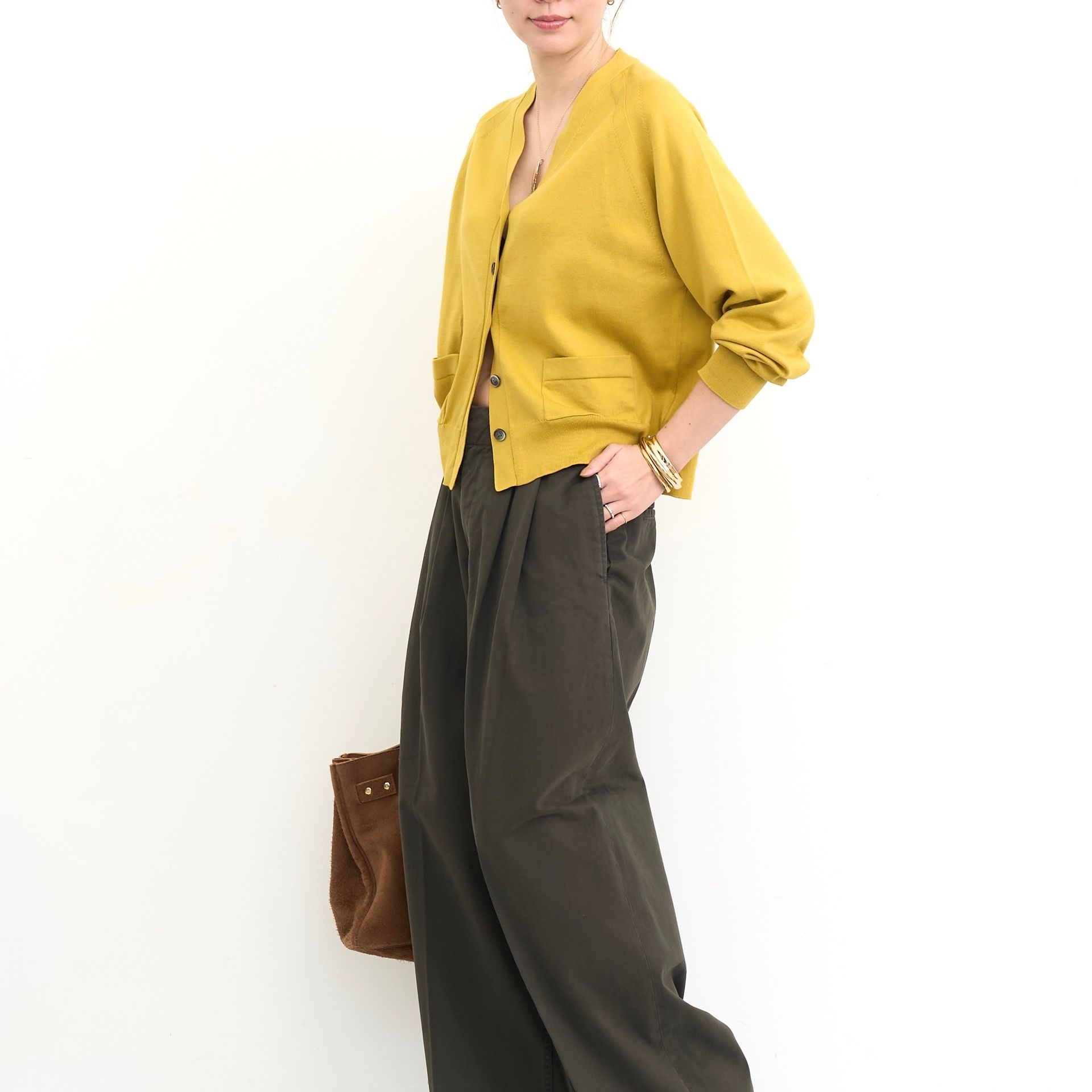 ラグランスリーブのカーディガンはややコンパクトなサイズ感でボリュームのあるボトムとも好相性です。