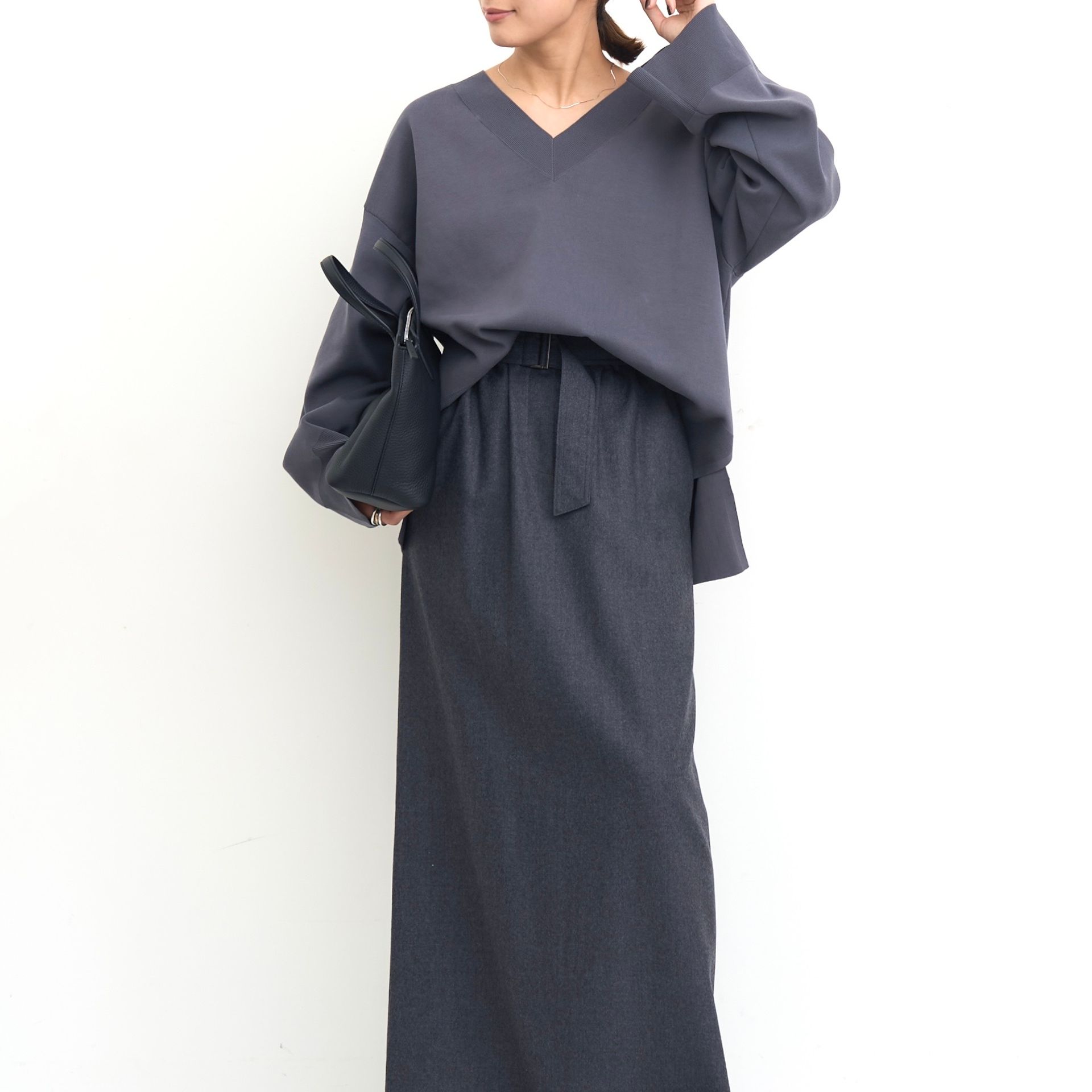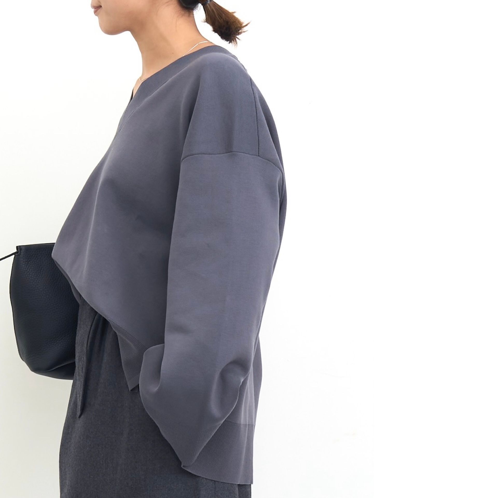 プルオーバーは肩線を丸くなだらかにし、シンプルさと絶妙なサイズ感で様々なスタイリングに合わせやすい。