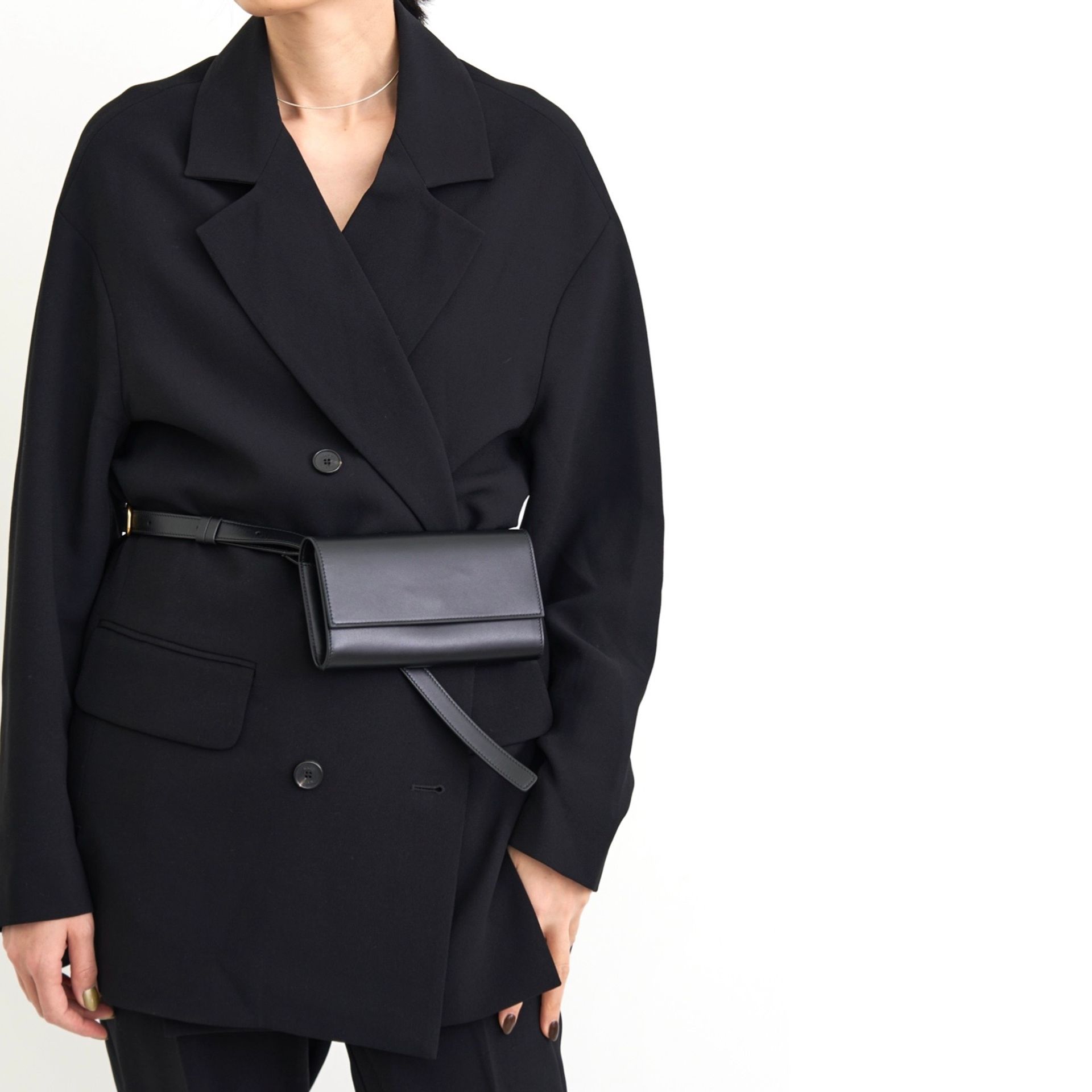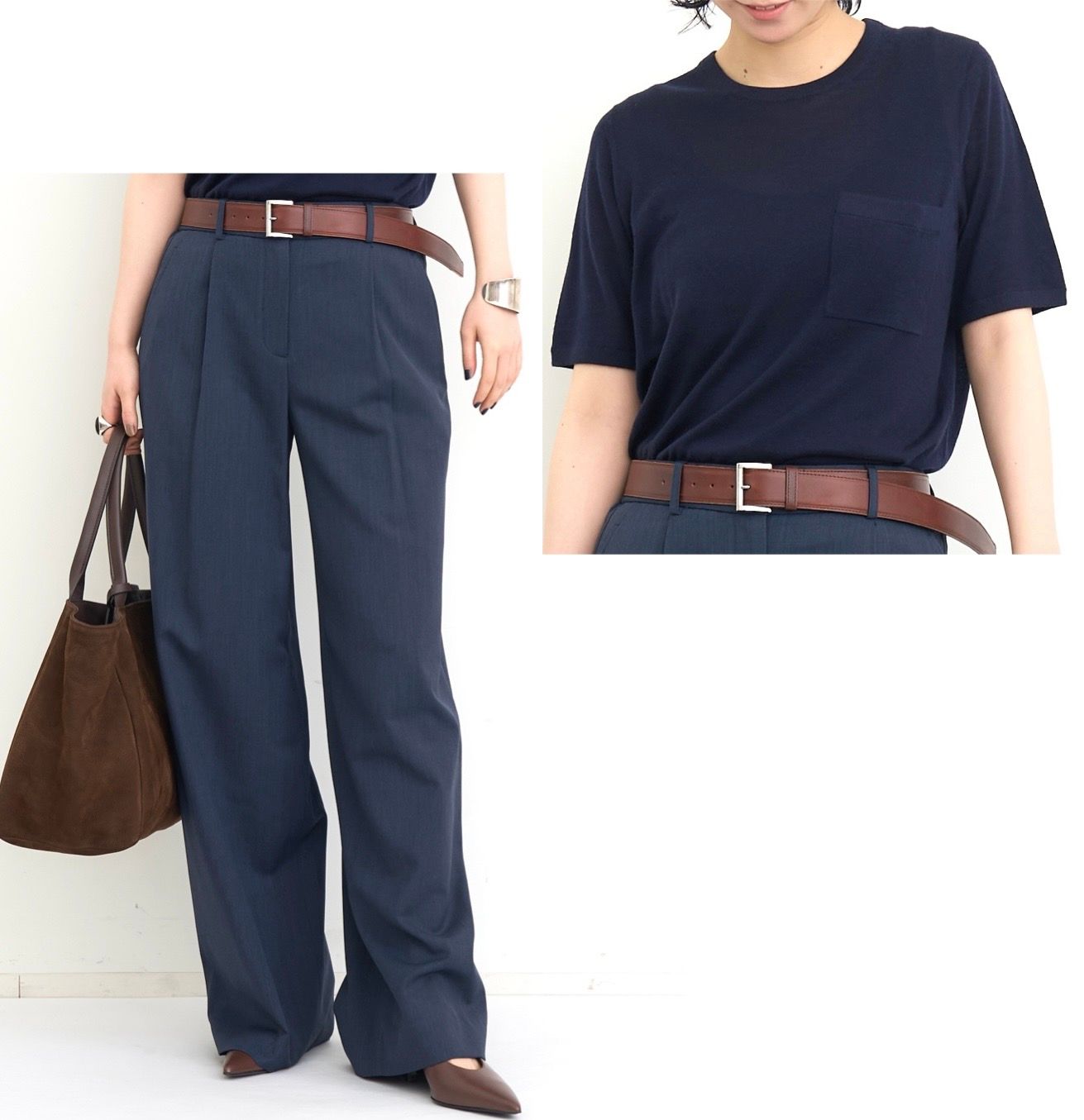 ワイドシルエットのパンツにはシンプルなトップスを合わせ、太めのベルトをアクセントに。