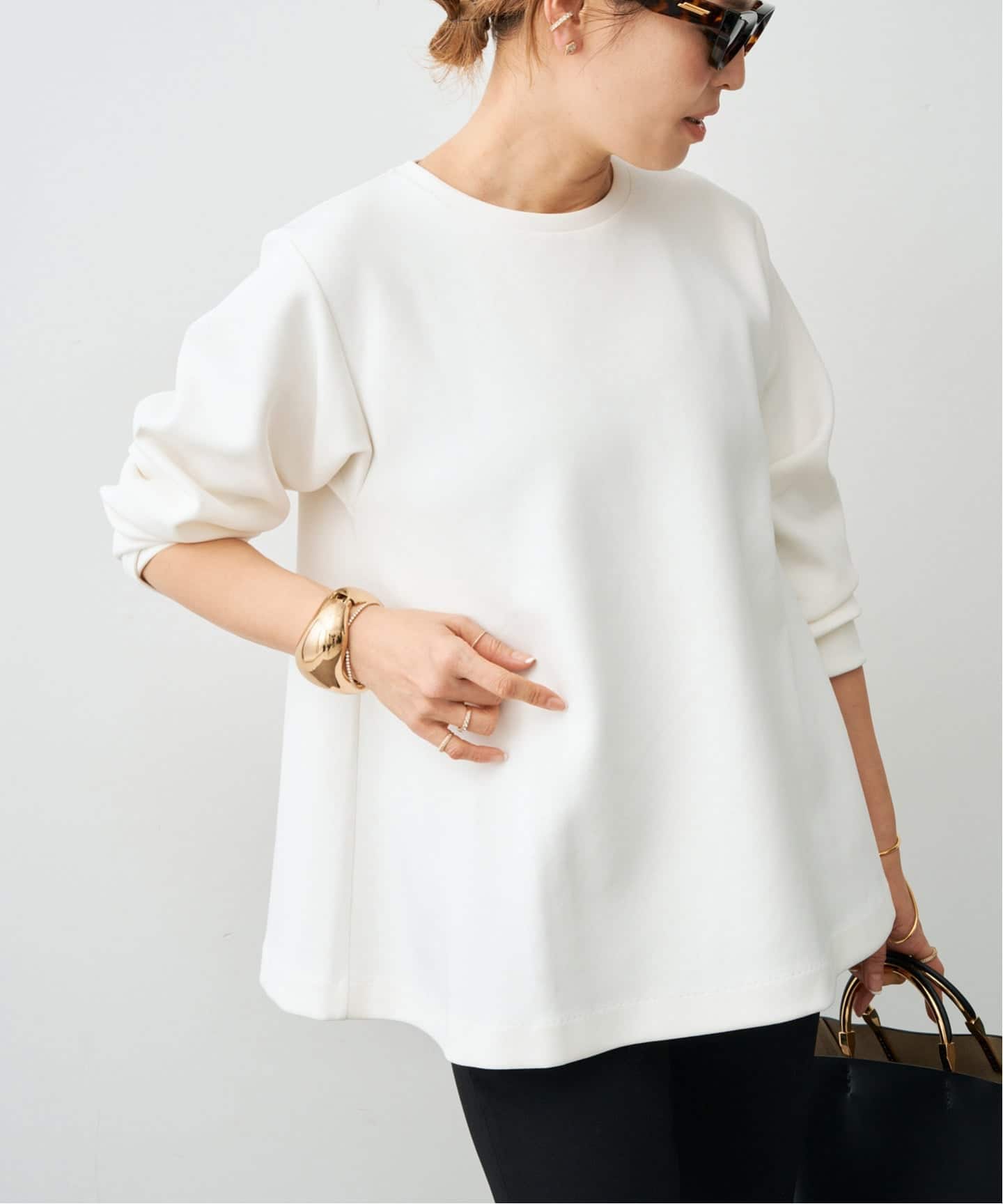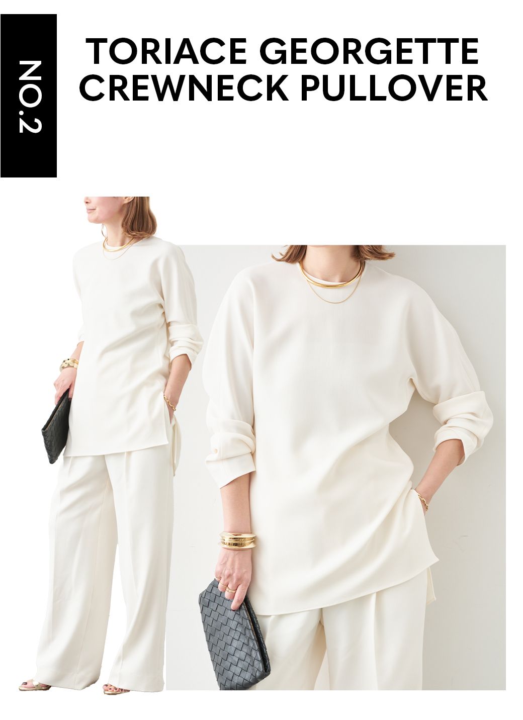 トリアセシリーズはブラウスもNEWラインに。ニュアンスが生まれるドルマンラインから自然とウエストにかけてシェイプされるシルエット。ただコンサバに落ち着かないナチュラルなムードこそが女性らしい柔らかさとモダンさをつくり上げる。