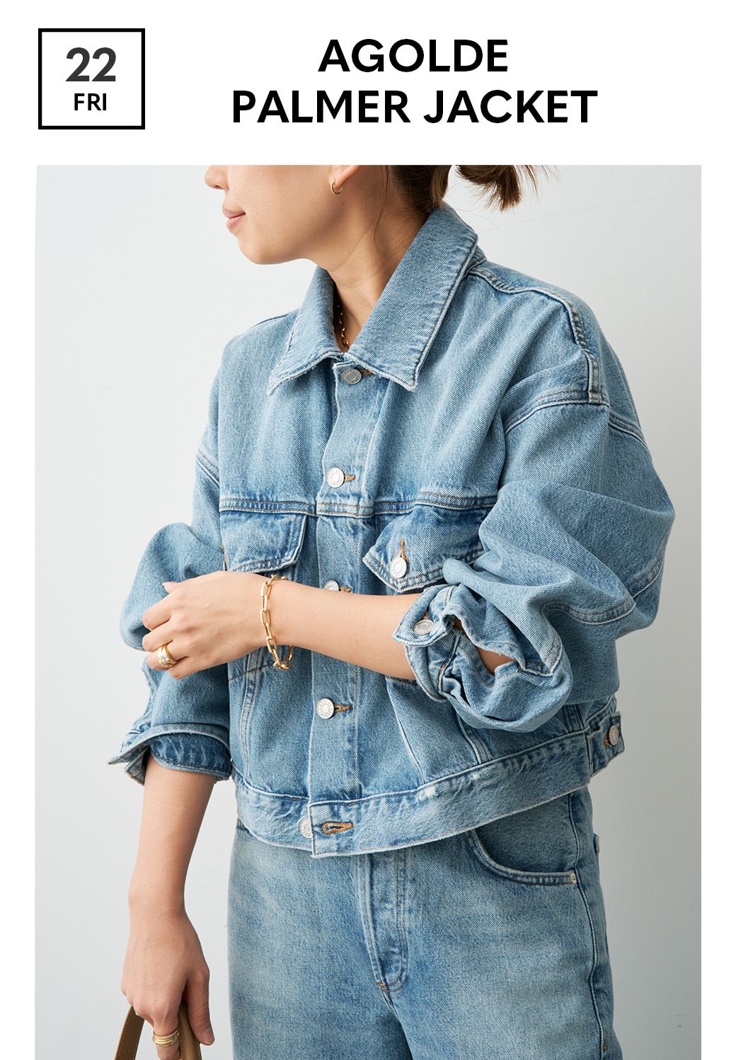 ボリュームのある袖にクロップド丈の今着たいバランスが詰まったデニムジャケット。コンパクトながらに肩が落ちてくたっと感じる風合いの良さでこなれたムードを醸し出す。