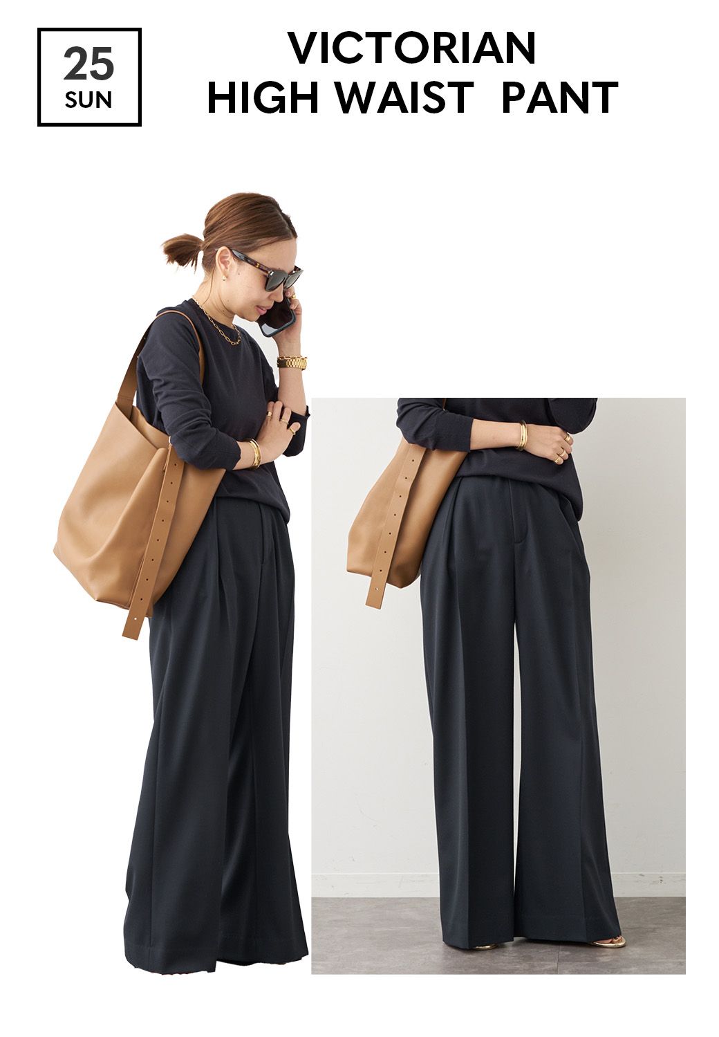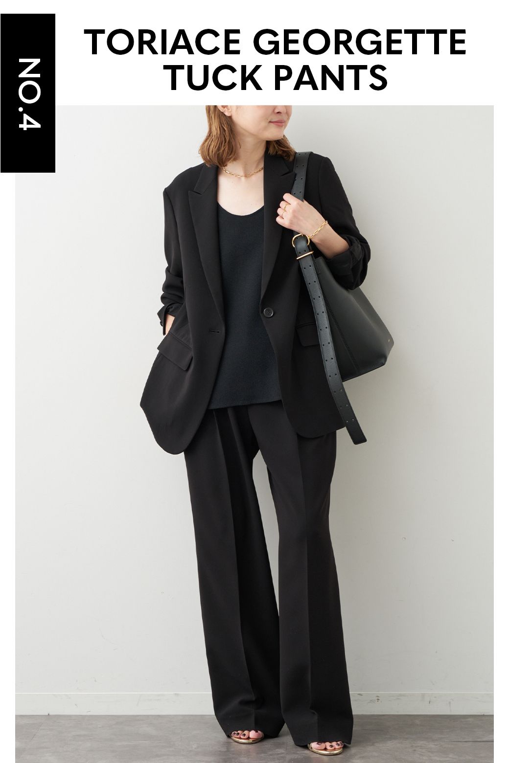 ハイウエストで自然と脚長効果も発揮し、しなやかで美しい素材の落ち感がラインの良さを引き立てる。
