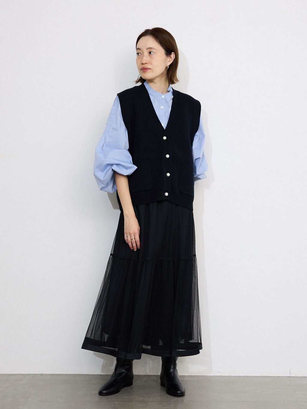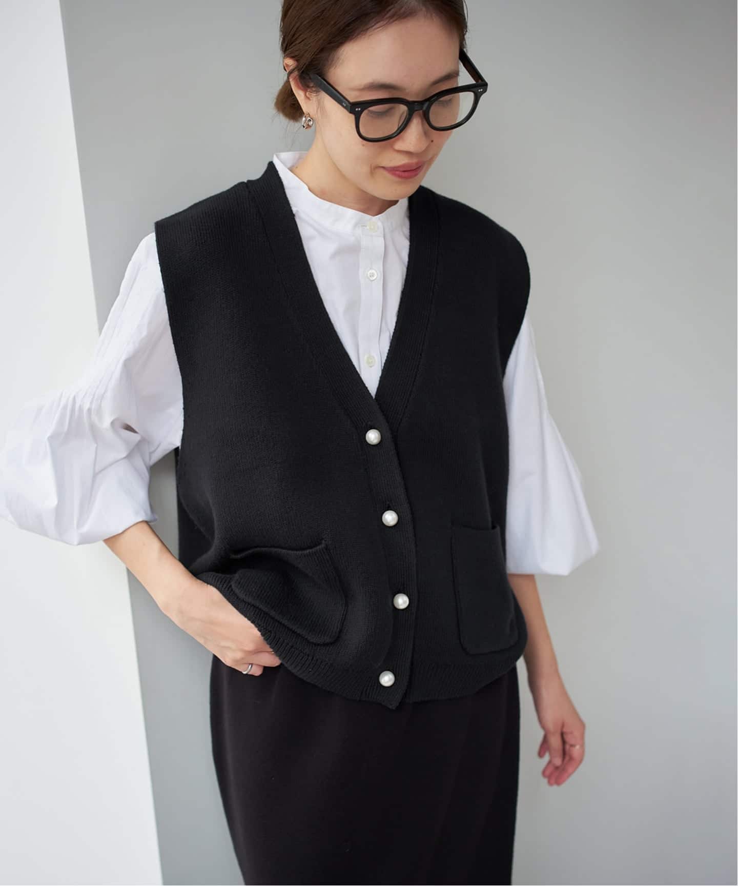パールボタンが付いた大人に着こなせるニットベスト。