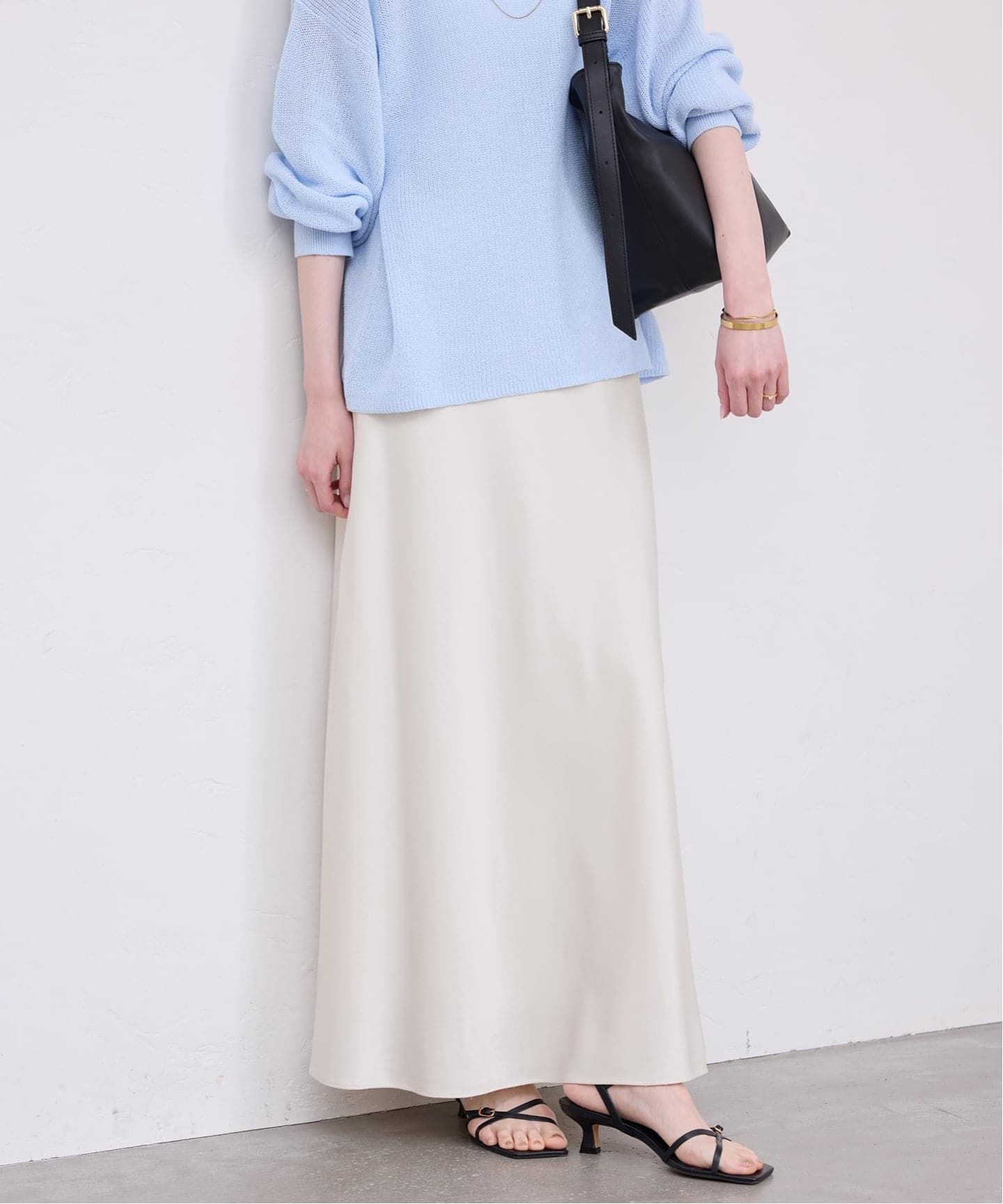 濡れたような光沢がポイントのサテン素材で、ニットやスウェットとも相性抜群。
