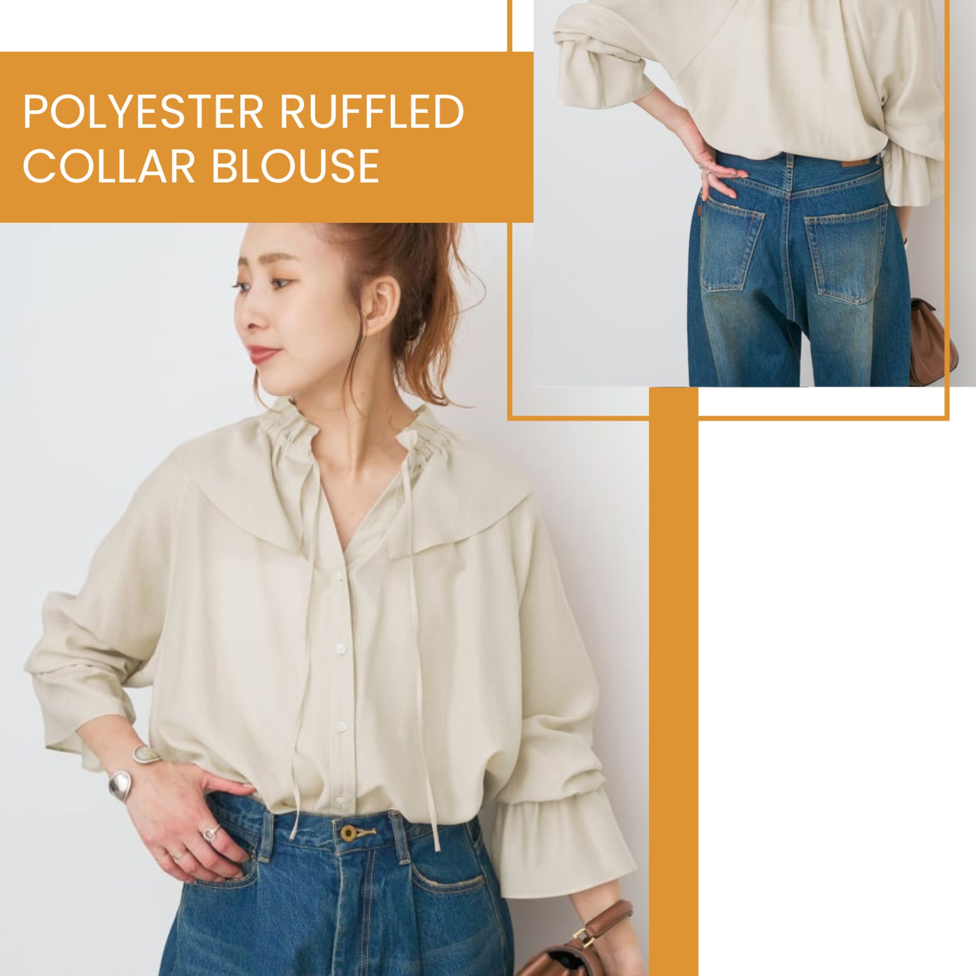 華やかなラッフルカラーが印象的なポリアセテートブラウス。
