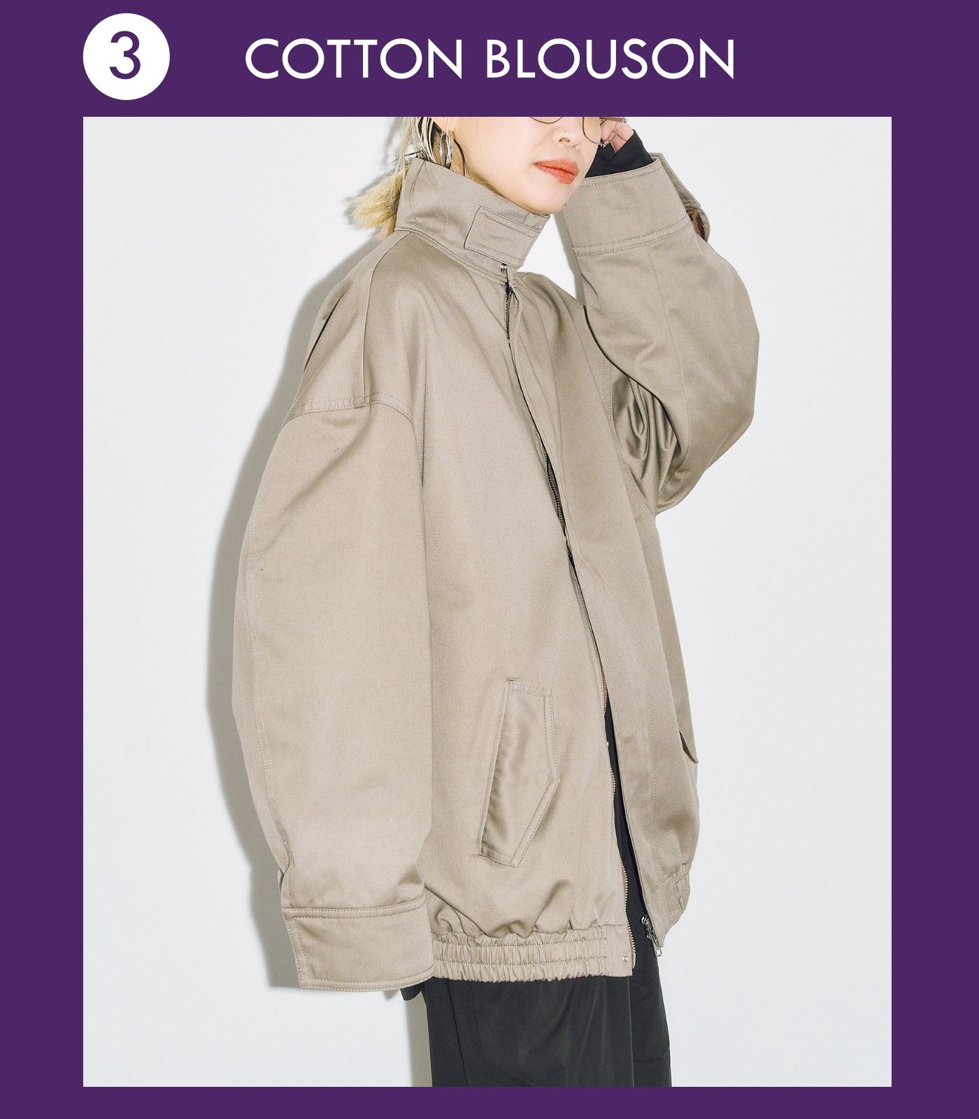 抜け感の出るオーバーサイズのボディに、ゴム入りのギャザーヘムライン・チンストラップ付スタンドネックのディティールが光るブルゾン。