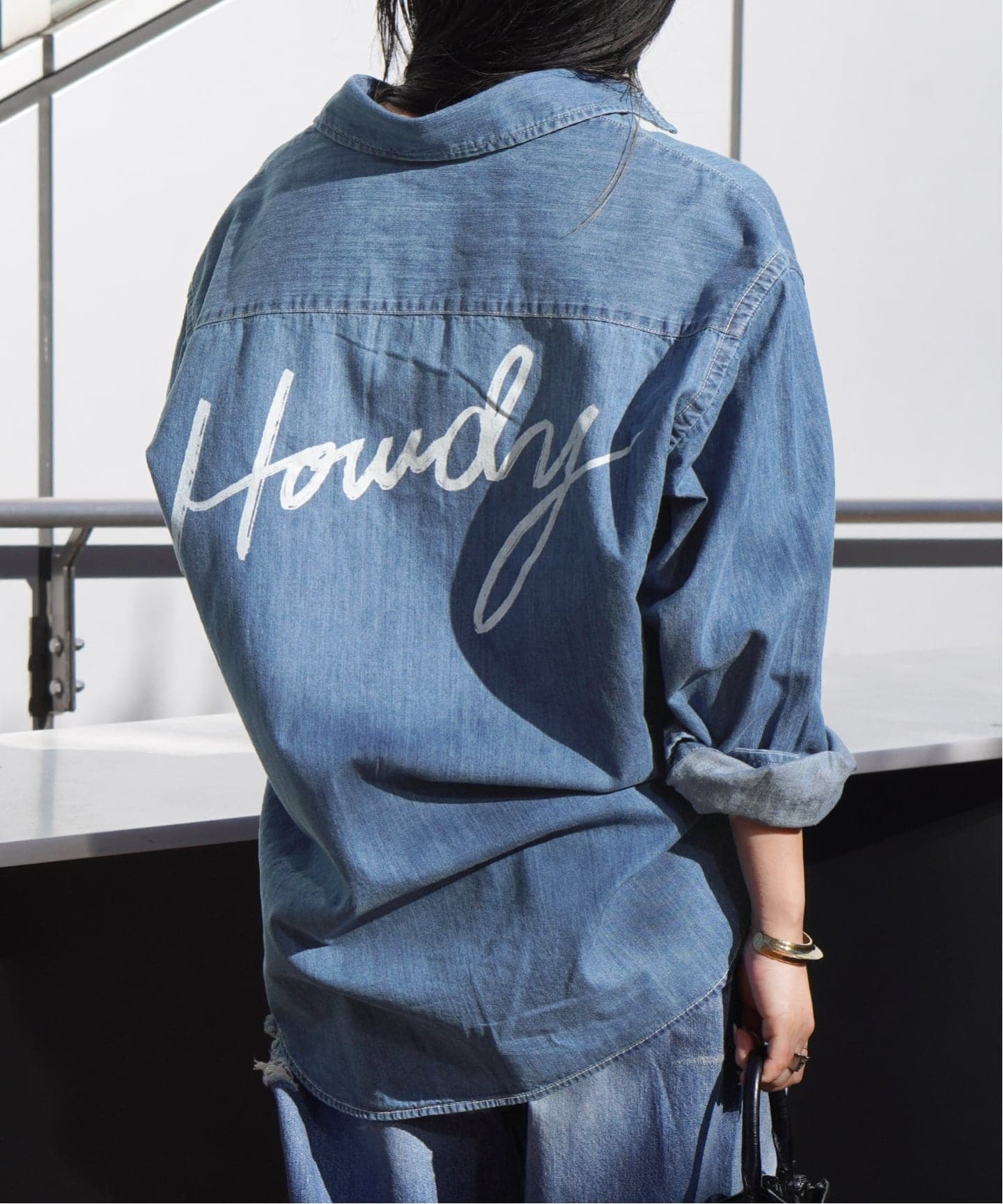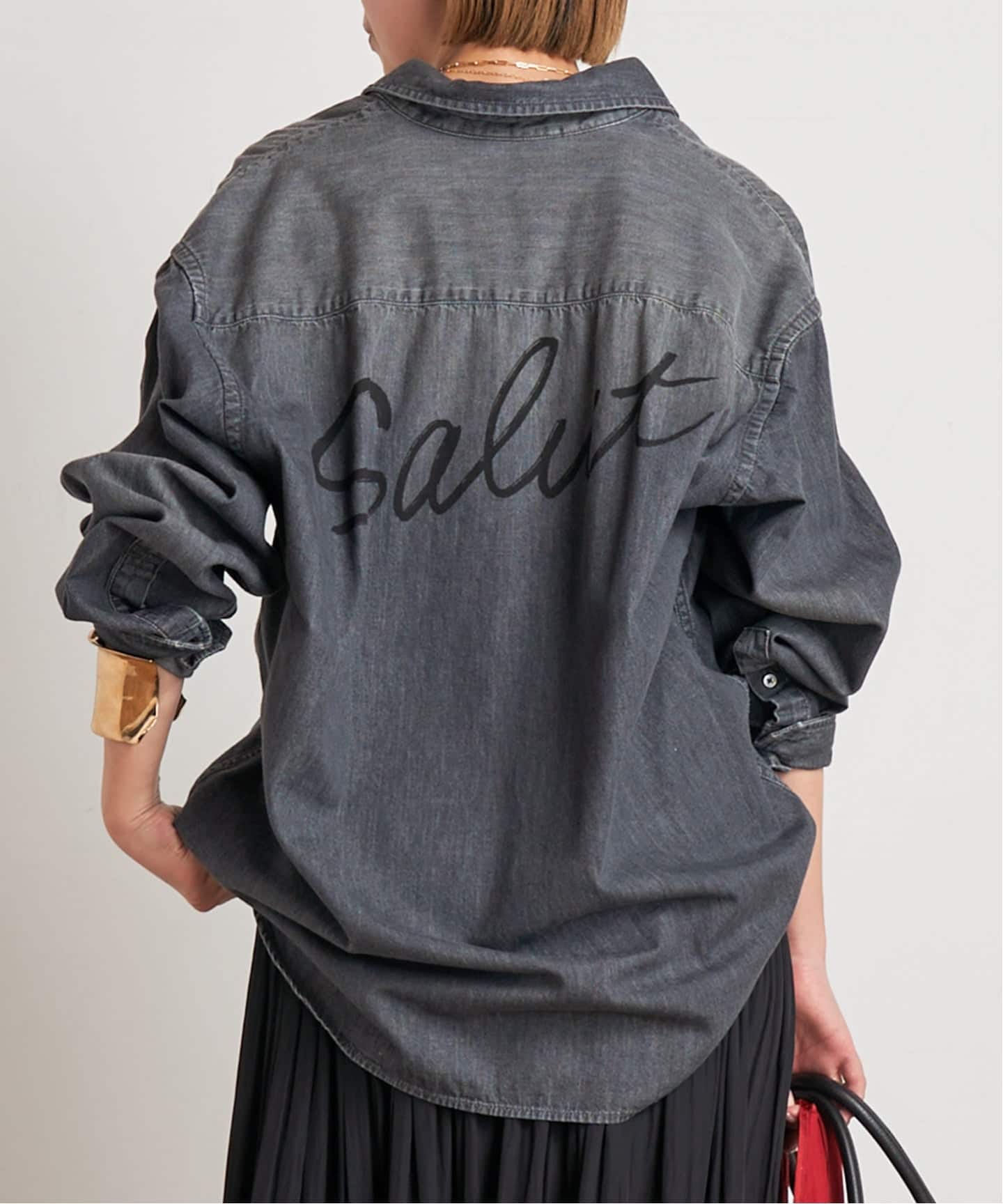 バイオブリーチ加工を施したライトデニムにバックプリントを施したシャツは、メンズシャツを着ているかのようなオーバーなサイズ感もポイント。