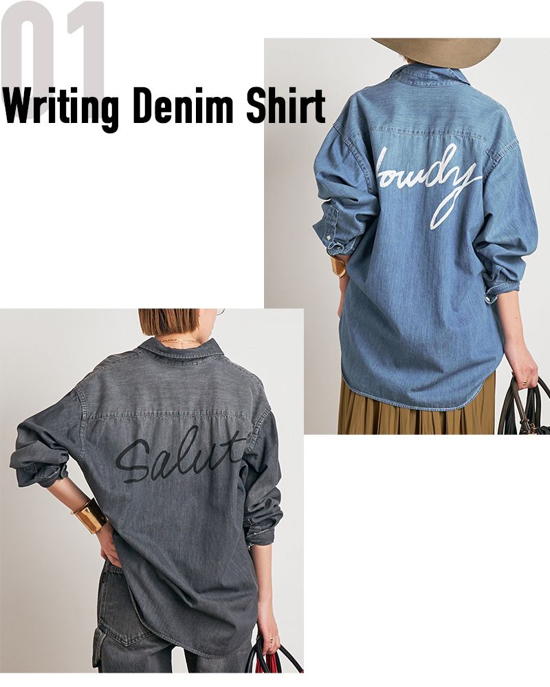 手書き風のバックプリントが印象的なデニムシャツ。