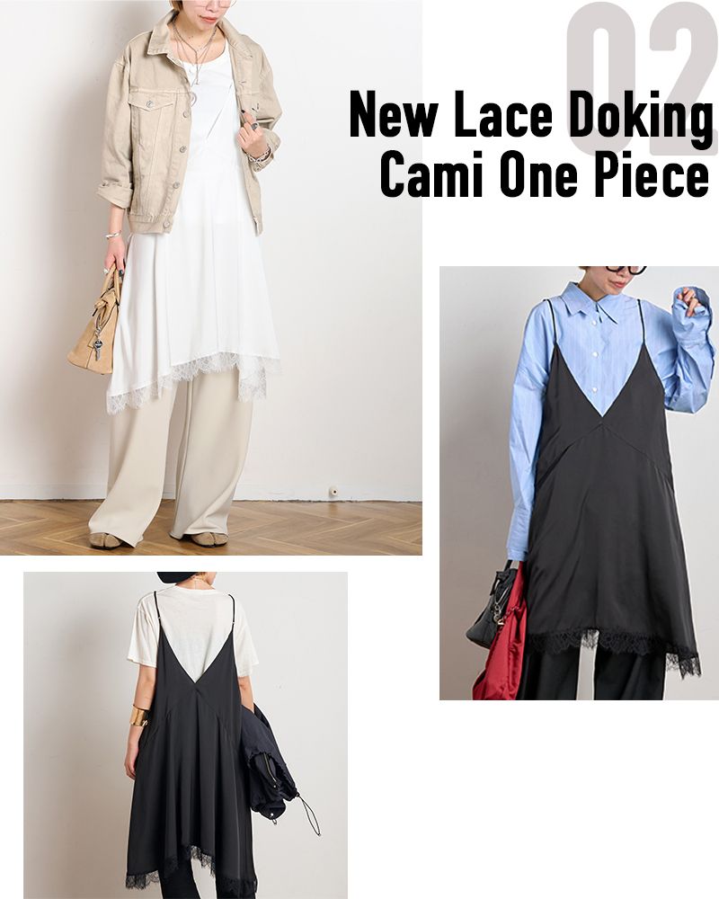 上品な光沢と落ち感のあるポリエステルサテンを使用し、脇の方が長いイレギュラーヘムにレースをあしらった深いVネックデザインで繊細かつヘルシーな一枚。